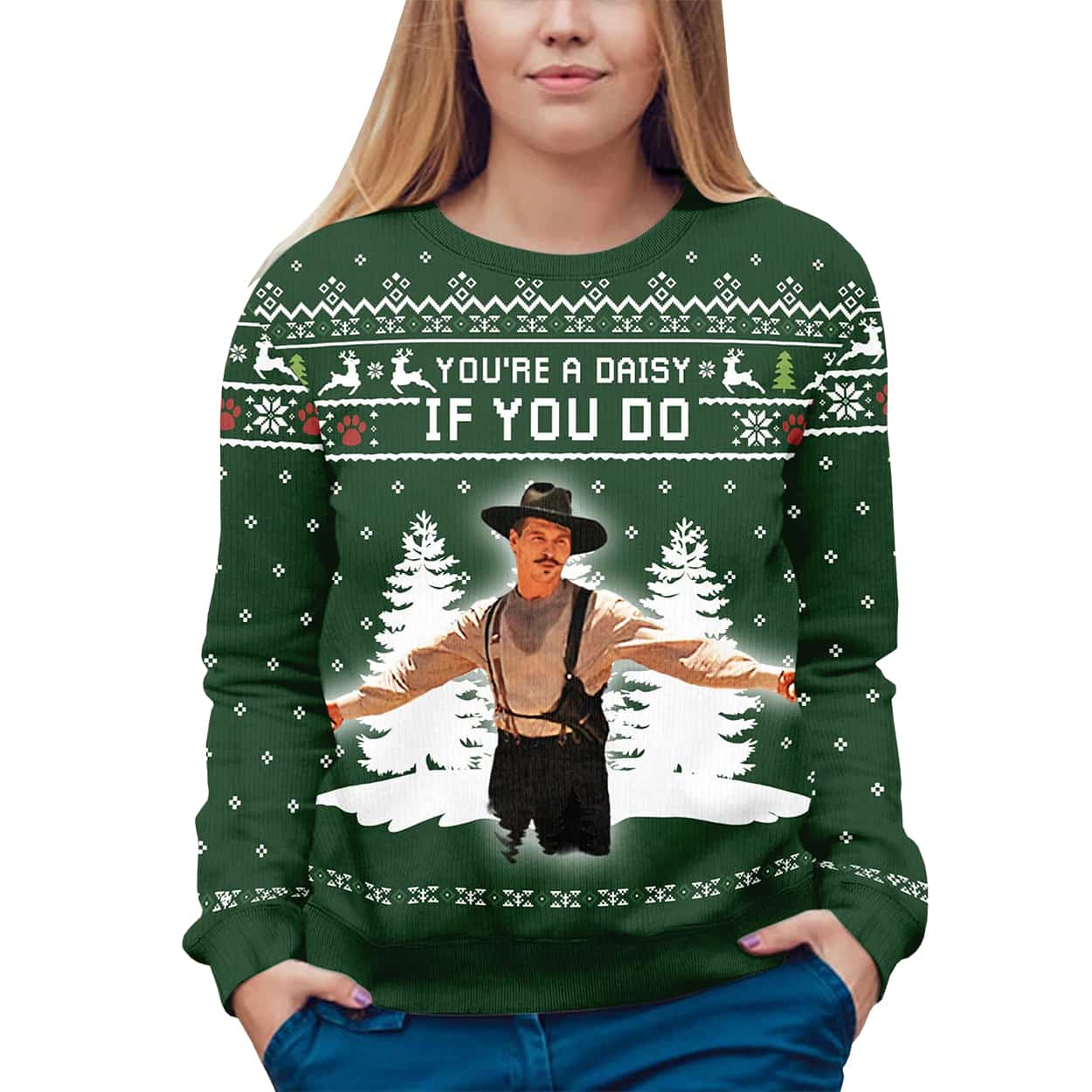 Make your holiday wardrobe legendary with this bold and cheeky Christmas sweater featuring the iconic gunslinger Doc Holliday, as portrayed by Val Kilmer in Tombstone. Set against a backdrop of snowy pine trees and classic Christmas motifs—snowflakes, reindeer, and paw prints—the central image shows Doc in full Western regalia: wide-brimmed hat, suspenders, and holstered pistol, arms outstretched in dramatic flair. Above him, the quote “YOU’RE A DAISY IF YOU DO” adds the perfect punch of swagger and wit, making this sweater a standout at any festive gathering.