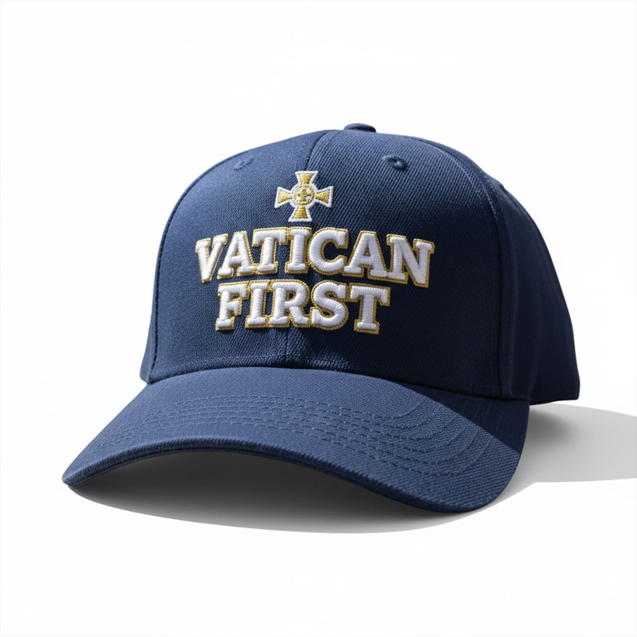 Step into the spotlight with this hat, a headwear masterpiece that blends bold messaging with timeless style. This navy blue cap features a structured crown and curved brim, casting a confident silhouette. Front and center, the embroidered slogan “VATICAN FIRST” pops in white lettering outlined in gold—unapologetically proud and unmistakably clear. Above the text, a radiant gold-and-white cross adds a touch of divine symbolism, making this hat more than just an accessory—it’s a declaration.
