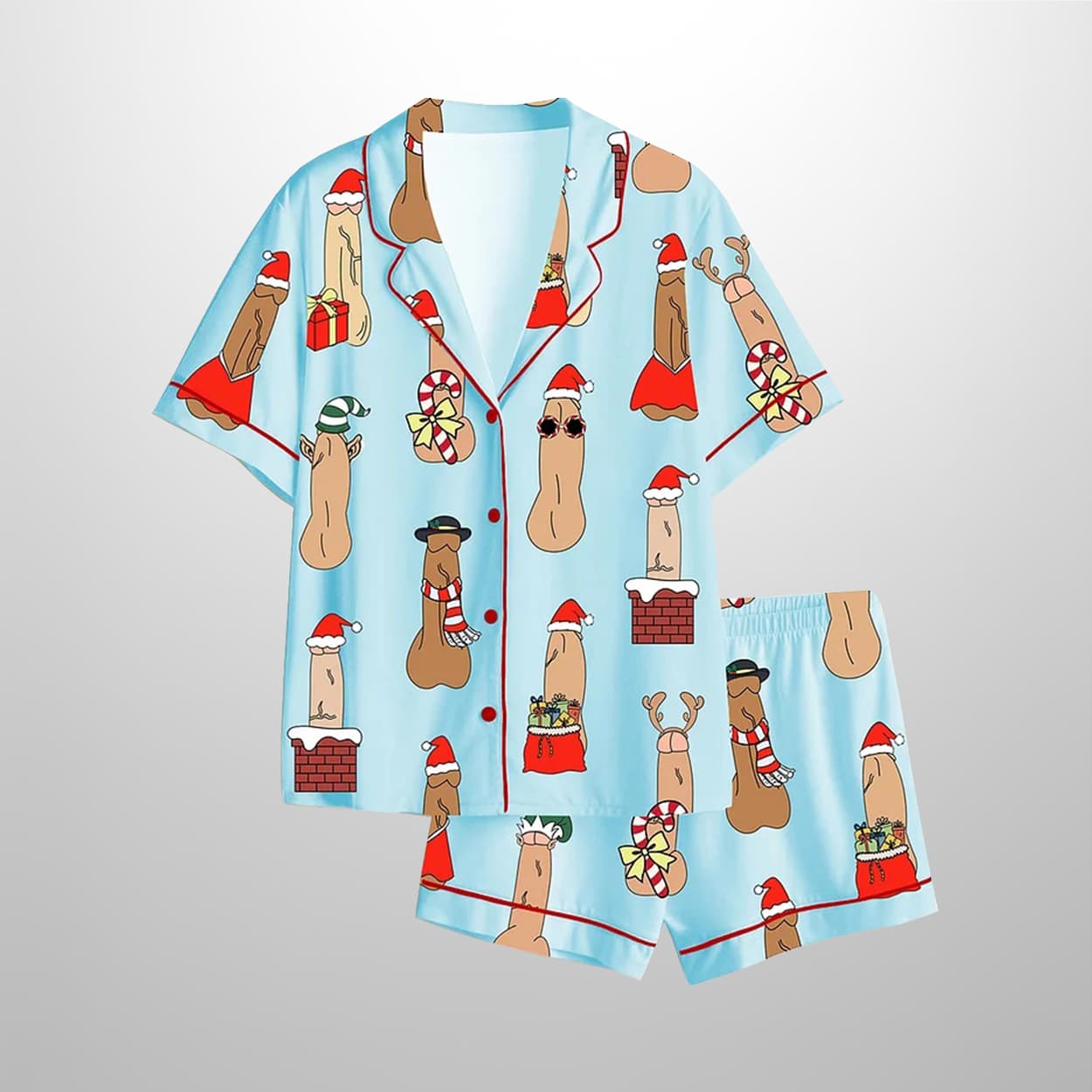 This pajama set is a holiday party in print. Featuring a short-sleeved button-up shirt and matching shorts, it’s covered in a hilariously festive pattern of sausage-shaped characters dressed in Santa hats, reindeer antlers, and sunglasses. Some are popping out of chimneys, others are surrounded by candy canes and wreaths, all striking poses that toe the line between naughty and nice. Red piping along the edges adds a classic Christmas touch to this wildly unconventional design. It’s the perfect outfit for those who like their holiday spirit with a side of sass.
