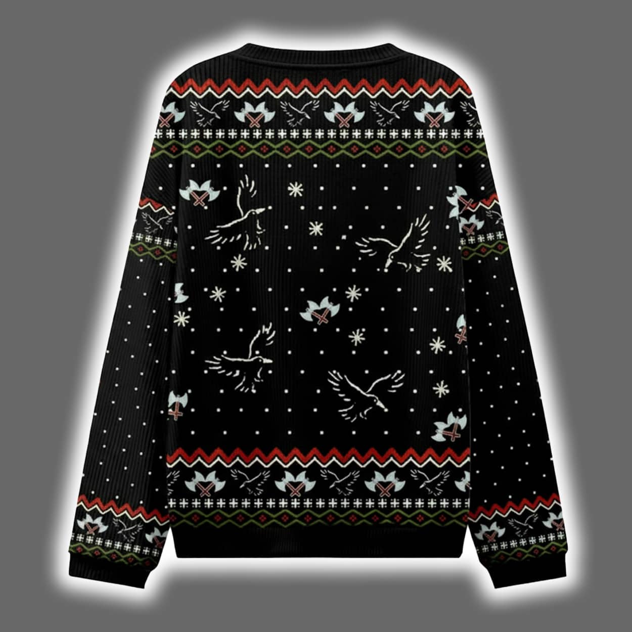 Make a legendary entrance at your next holiday party with this sweater. This eye-catching design features a fierce Viking warrior riding a reindeer into battle—armed not with a sword, but a giant candy cane. Snowflakes swirl around the scene, while festive red, green, and white patterns frame the action. The reindeer is decked out in holiday decorations, and the background includes flying birds and a snowy landscape, adding depth and whimsy. On the lower front, three circular symbols in red and green add a mysterious, rune-like touch.