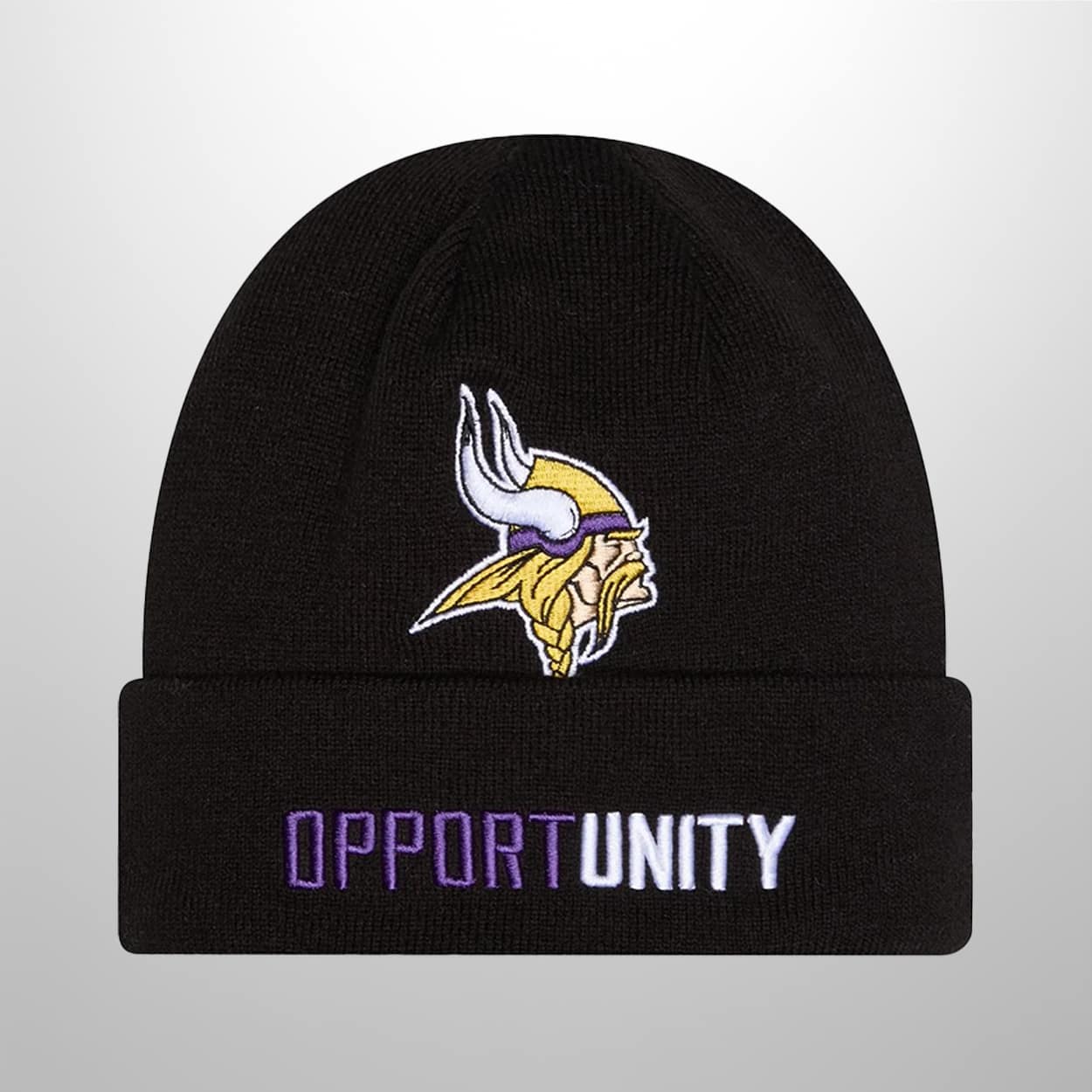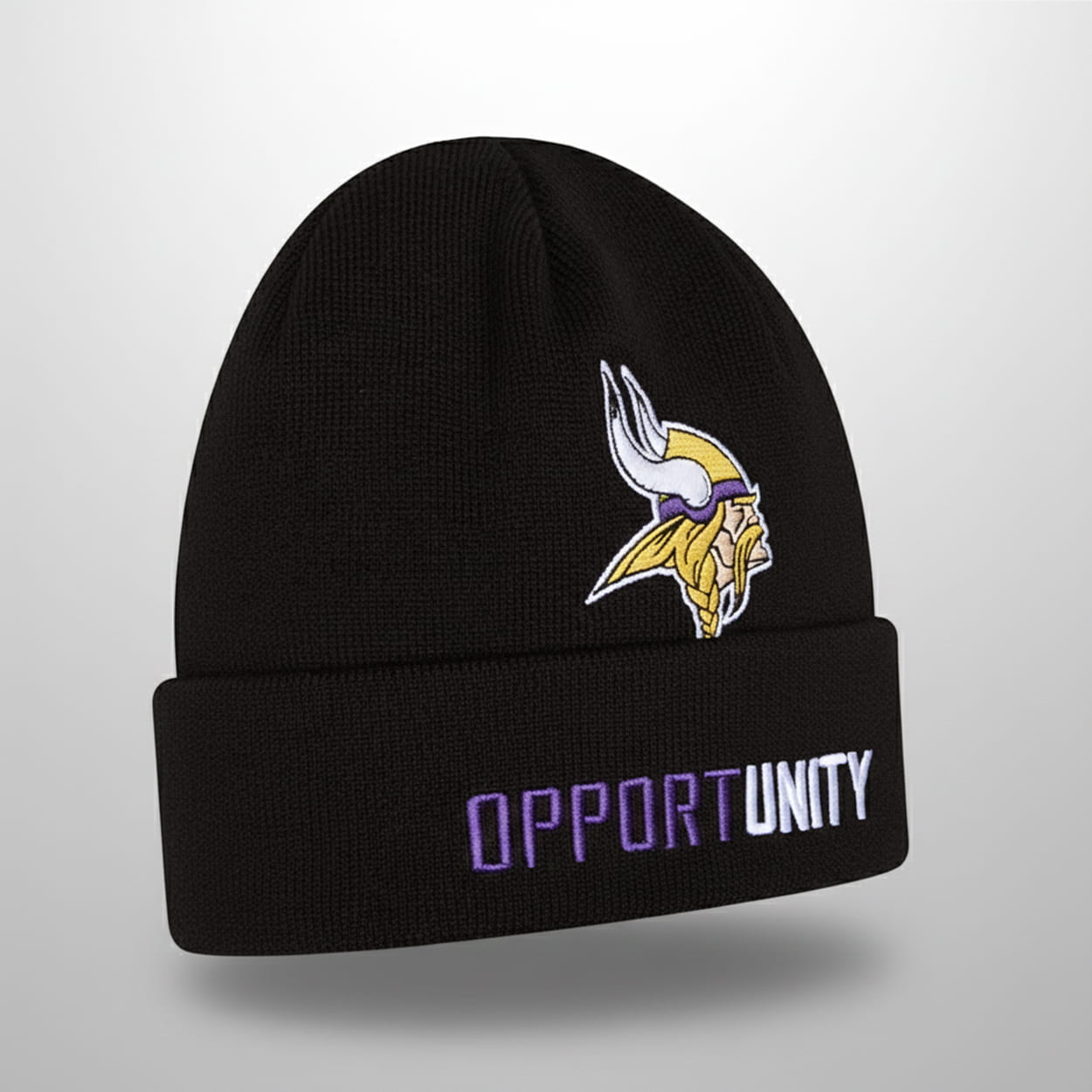 Step into the season with a beanie that blends fierce fandom and forward-thinking flair. This hat features the iconic Vikings logo—a determined Viking head with a golden helmet and white horns—embroidered front and center. Just beneath it, the word “OPPORTUNITY” is stitched across the brim, split into “OPPORT” in bold purple and “UNITY” in bright white. It’s a clever visual cue that turns heads and sparks conversations, perfect for fans who stand for more than just touchdowns.