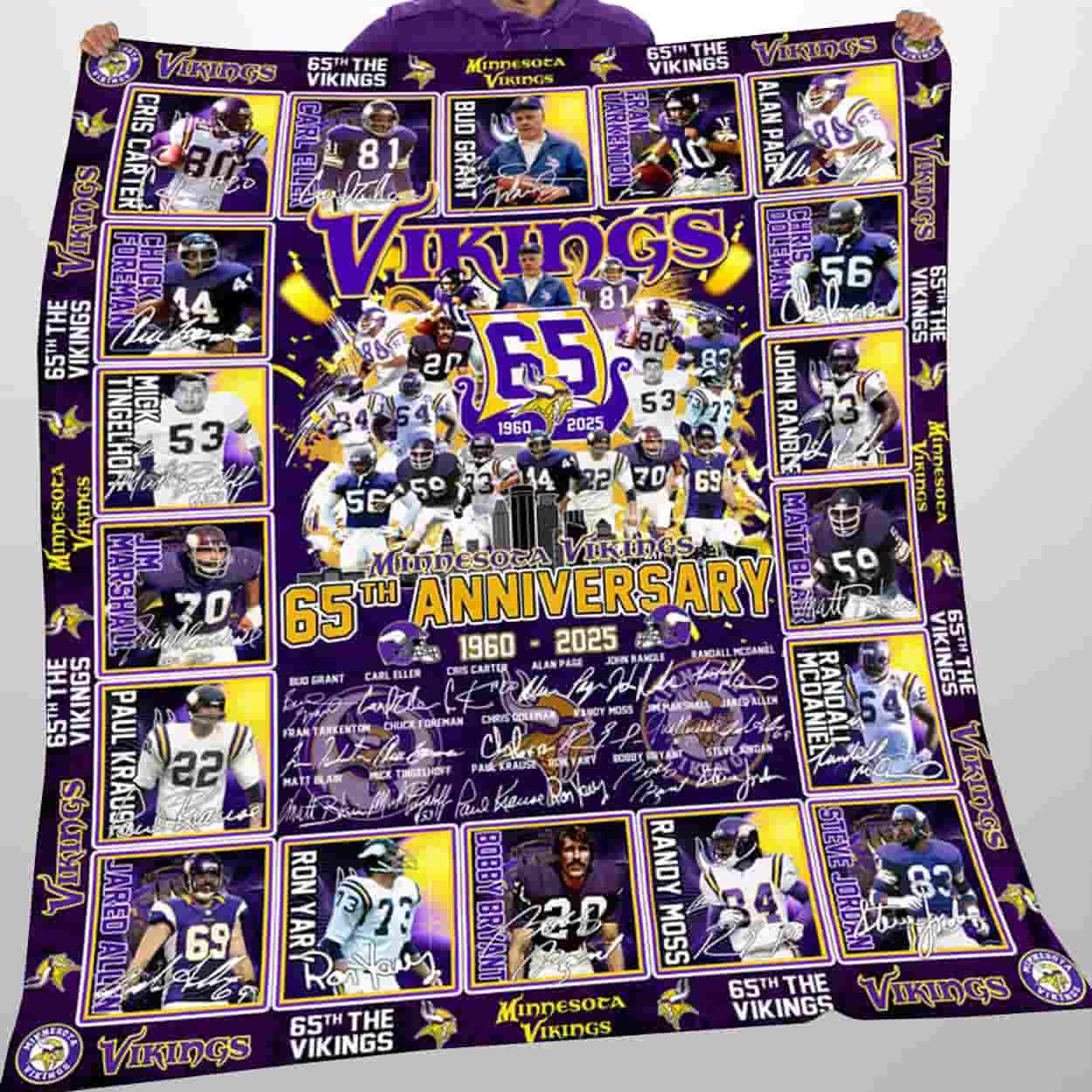 Get ready to SKOL like never before with this blanket. This commemorative masterpiece showcases a vibrant collage of legendary players, each framed with their name and jersey number in action-packed glory. At the center, the bold text “Vikings 65” and “Vikings 65th Anniversary 1960–2025” anchors the design, surrounded by a heroic group image of team icons. The border roars with phrases like “Minnesota,” and “65th The Vikings,” all wrapped in the team’s signature purple, gold, and white palette.