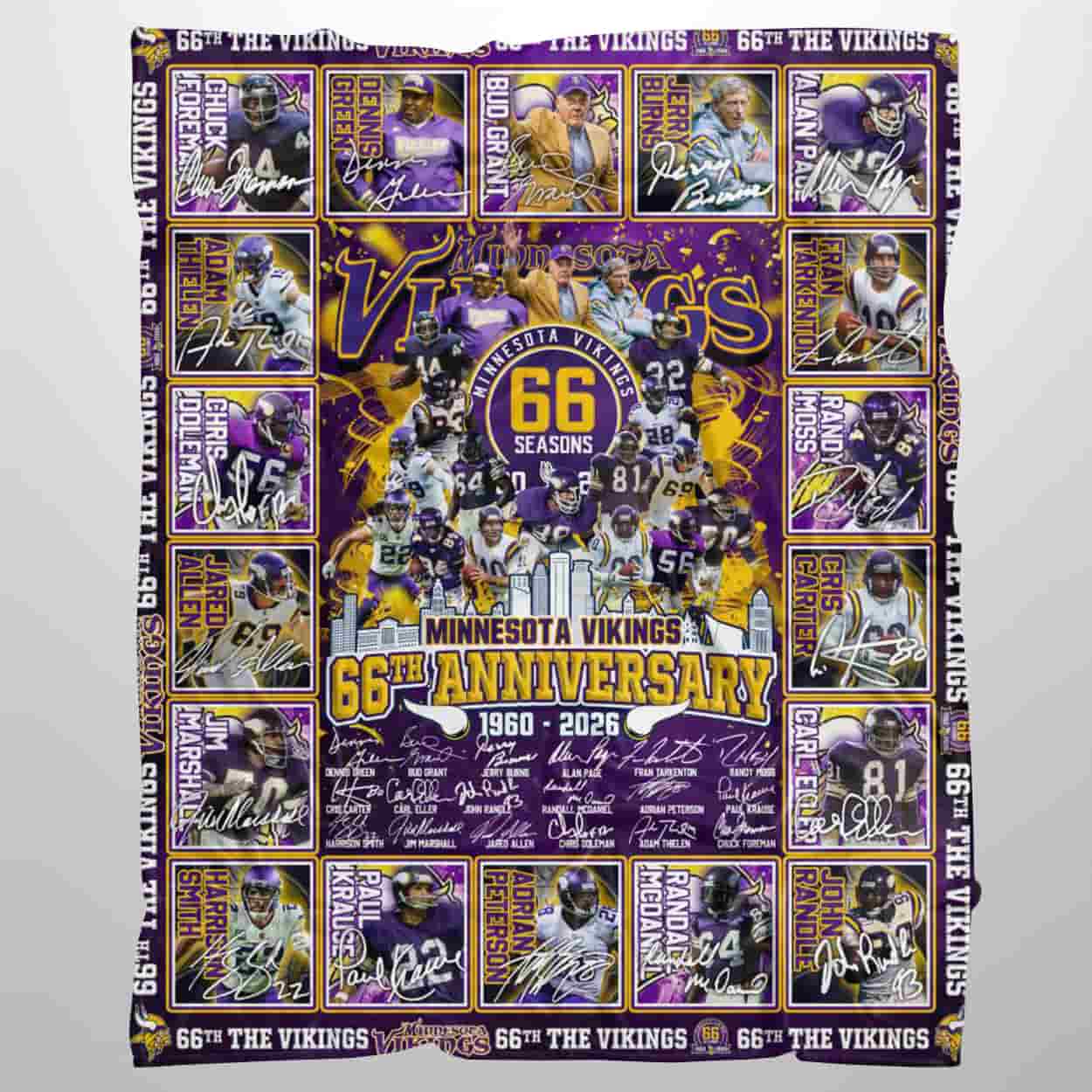 Celebrate 66 seasons of Vikings glory with this Vikings 66th Anniversary 1960-2026 Blanket featuring legendary players and iconic team spirit.