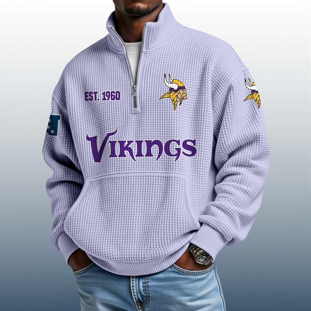 Show off your Vikings pride with the Vikings Est 1960 Stand Collar Half Zip Waffle Sweatshirt—a bold, textured tribute to Minnesota’s gridiron legacy, perfect for fans who love comfort with character.