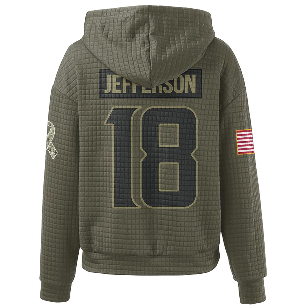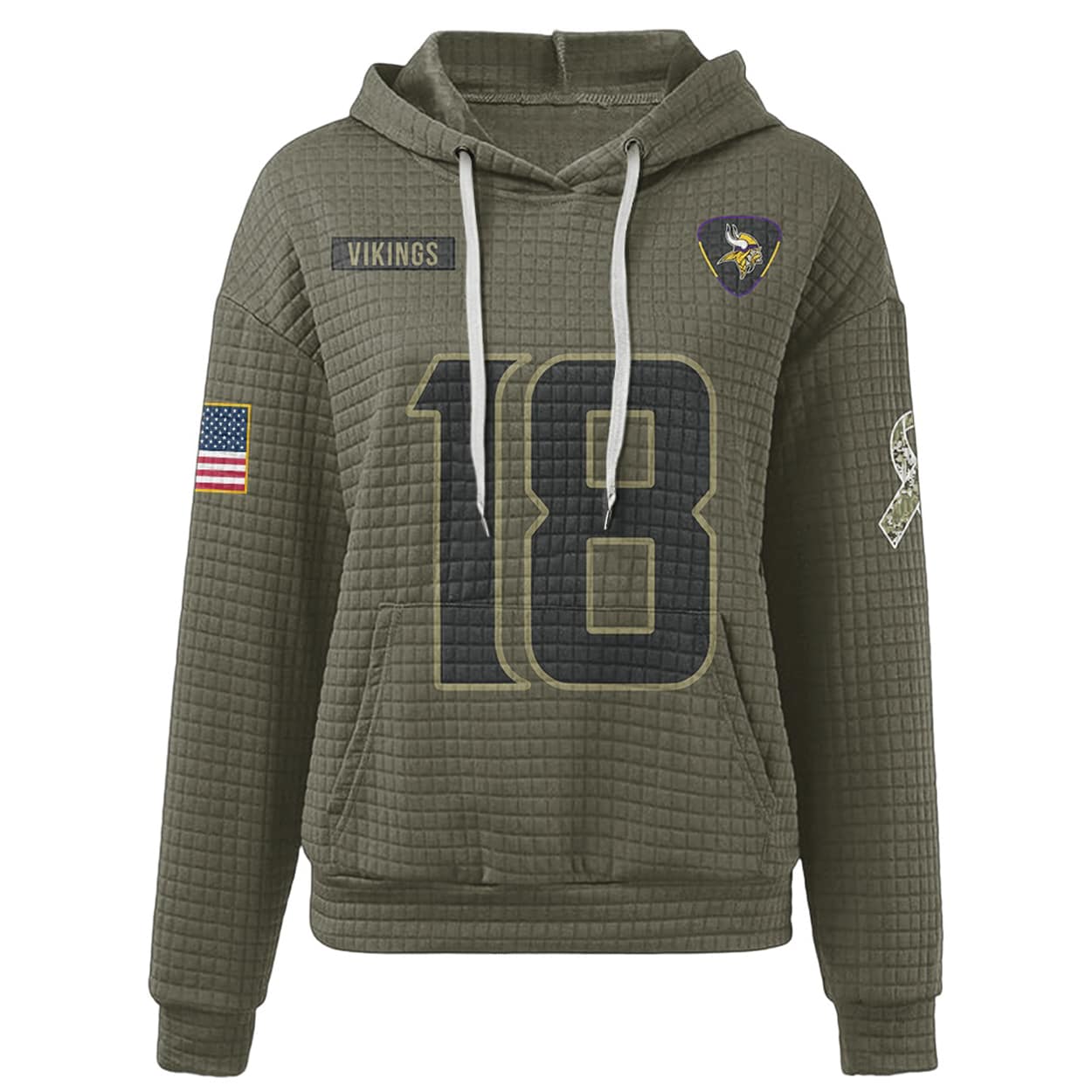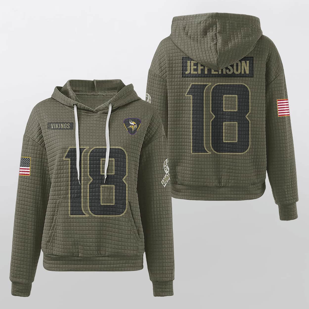 Ready to wear your pride on your sleeve? Grab the Vikings Veterans Day Justin Jefferson 18 Waffle Hoodie and show the world you stand for greatness, both on and off the field.