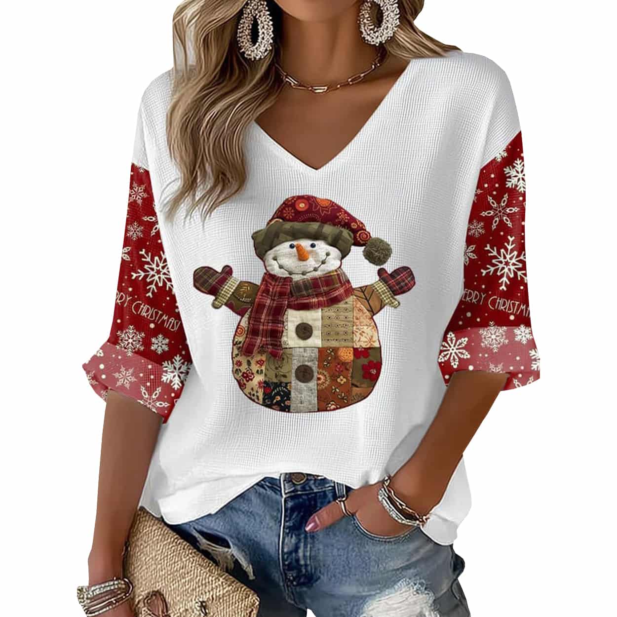 Turn heads and warm hearts with this shirt. This winter-ready top features a playful patchwork-style snowman front and center, complete with a red-and-green hat, cozy scarf, and button details that bring the character to life. The crisp white V-neck silhouette is accented by vibrant red sleeves adorned with delicate white snowflakes, adding a dash of seasonal sparkle.