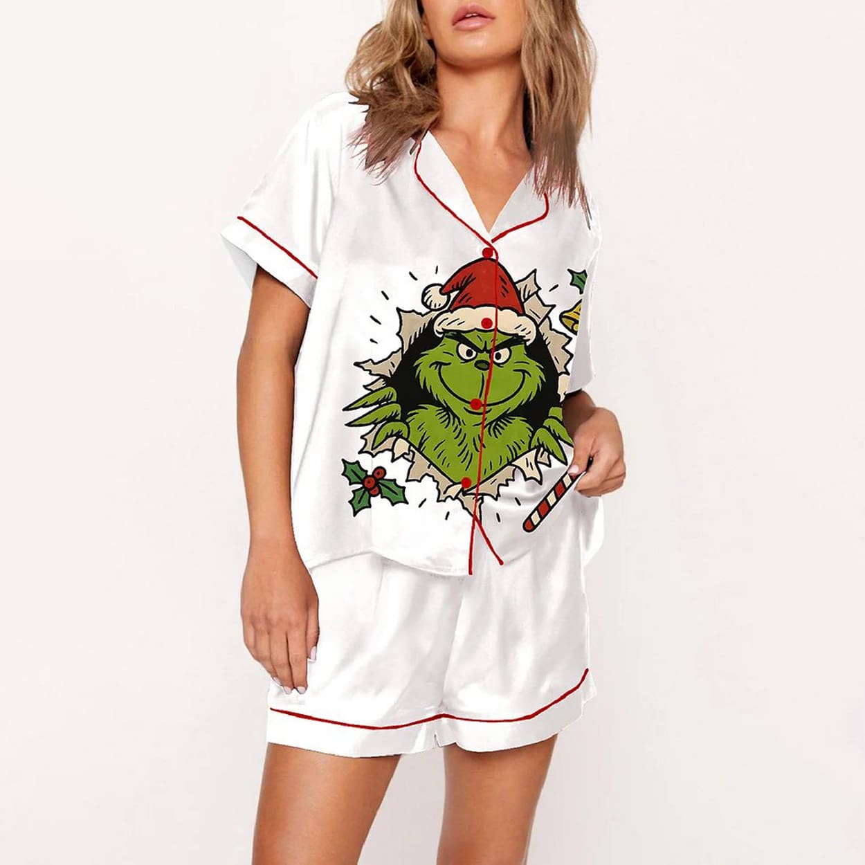 Add a dash of holiday mischief to your sleepwear with this pajama set. This cozy ensemble features a short-sleeved button-up top and matching shorts, both trimmed with bold red piping for a classic festive touch. Front and center on the shirt is a vibrant graphic of the Grinch himself, decked out in a Santa hat and surrounded by holly leaves, a bell, and a candy cane—because even the grumpiest holiday icon deserves a little sparkle. The clean white background lets the colorful design pop, making this set a standout choice for seasonal lounging.
