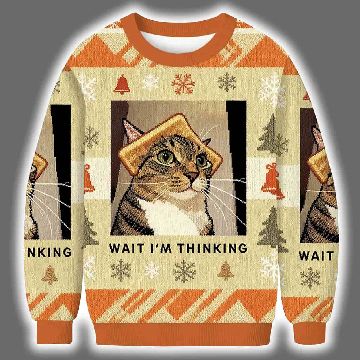This isn’t just another ugly Christmas sweater — it’s a wearable punchline. Featuring a contemplative cat with a slice of bread around its head, this design captures the essence of holiday confusion and existential pondering. Surrounded by classic winter motifs like snowflakes, Christmas trees, and bells in warm tones of orange, beige, and brown, the sweater strikes the perfect balance between festive and absurd. The bold text “WAIT I’M THINKING” adds a layer of dry humor that makes this piece a guaranteed conversation starter at any holiday gathering.