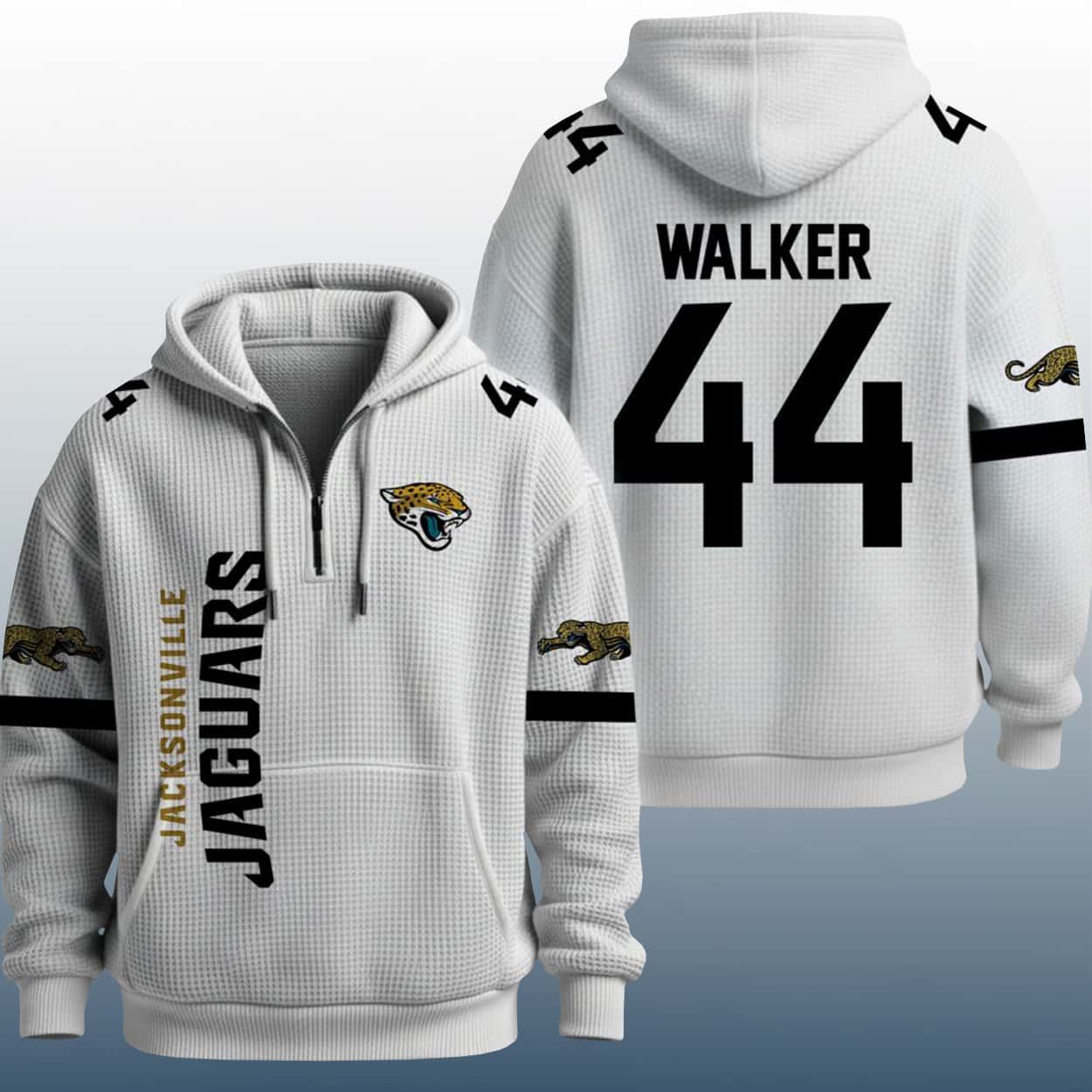 Unleash your inner Jaguar with the Walker 44 Jaguars Quarter Zip Waffle Hoodie—where fierce design meets fan pride. A bold tribute to Jacksonville’s defensive dynamo, this hoodie is made for those who lead with confidence.