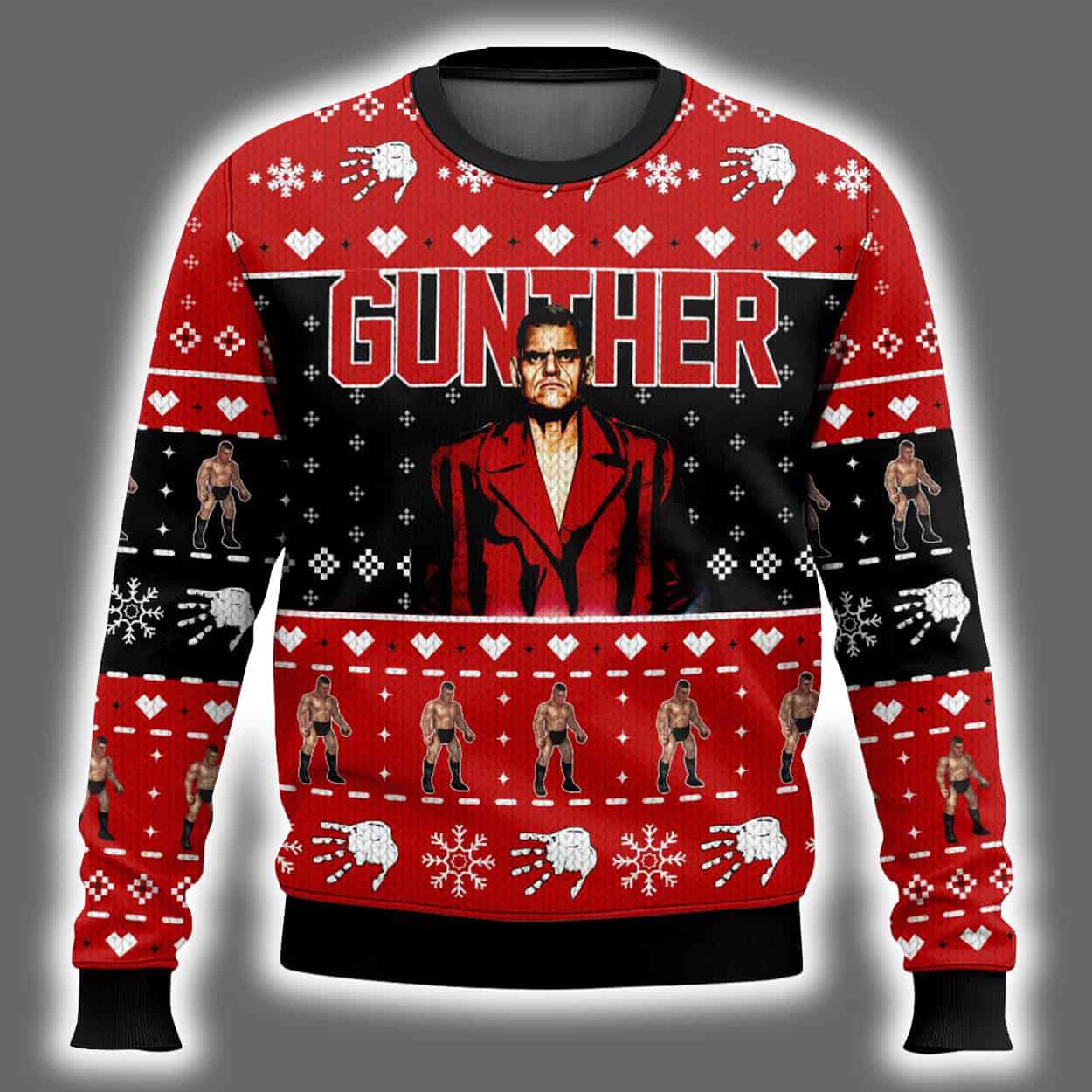 Step into the season with unapologetic flair in this sweater. Featuring a bold image of Gunther in a red suit, this design commands attention with his name “GUNTHER” emblazoned across the chest in striking red letters. Snowflakes, hearts, and reindeer dance across the black backdrop, while the back continues the festive motif with multiple images of Gunther in action. The symmetrical layout and vibrant color palette make this sweater a standout piece at any holiday gathering.