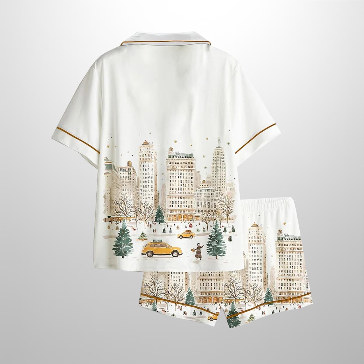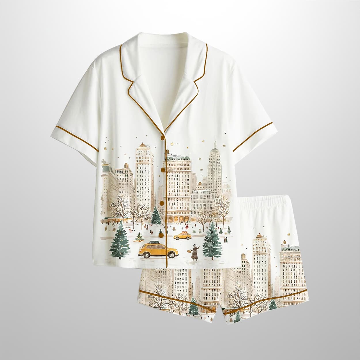 Step into a winter wonderland with this pajama set. This elegant ensemble features a short-sleeved button-up shirt and matching shorts, both adorned with a beautifully illustrated cityscape. Tall buildings, snow-dusted trees, yellow taxis, and bundled-up pedestrians bring the charm of a snowy New York day to life. The crisp white background enhances the watercolor-style artwork, while warm brown piping along the collar, button line, sleeves, and hems adds a refined touch. It’s a wearable postcard from the city that never sleeps—especially magical during the holidays.