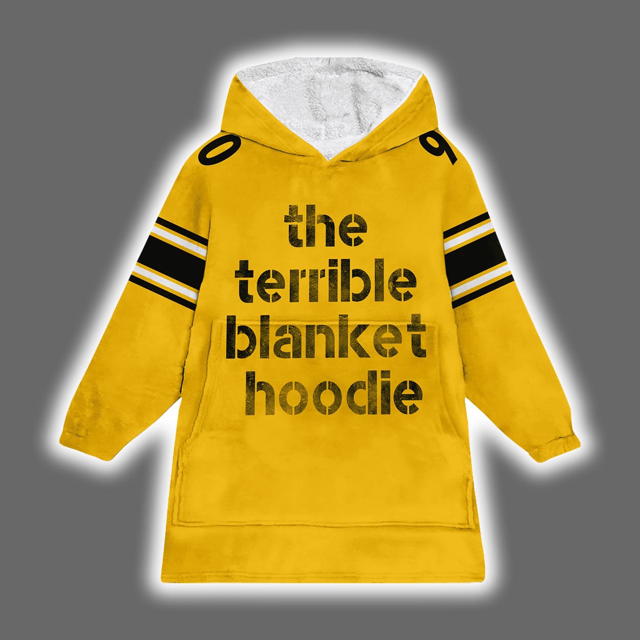 Say hello to the ultimate game-day flex. This oversized yellow hoodie channels the energy of a Pittsburgh football jersey with a twist of blanket-level comfort. The front boldly declares “the terrible blanket hoodie” in black lettering — a playful nod to the iconic Terrible Towel tradition. Flip it around and you’ll find “WATT” and the number “90” stamped in true jersey style, honoring the powerhouse linebacker T.J. Watt. With black-and-white sleeve stripes and matching shoulder numbers, this hoodie doesn’t just warm you up — it fires you up.