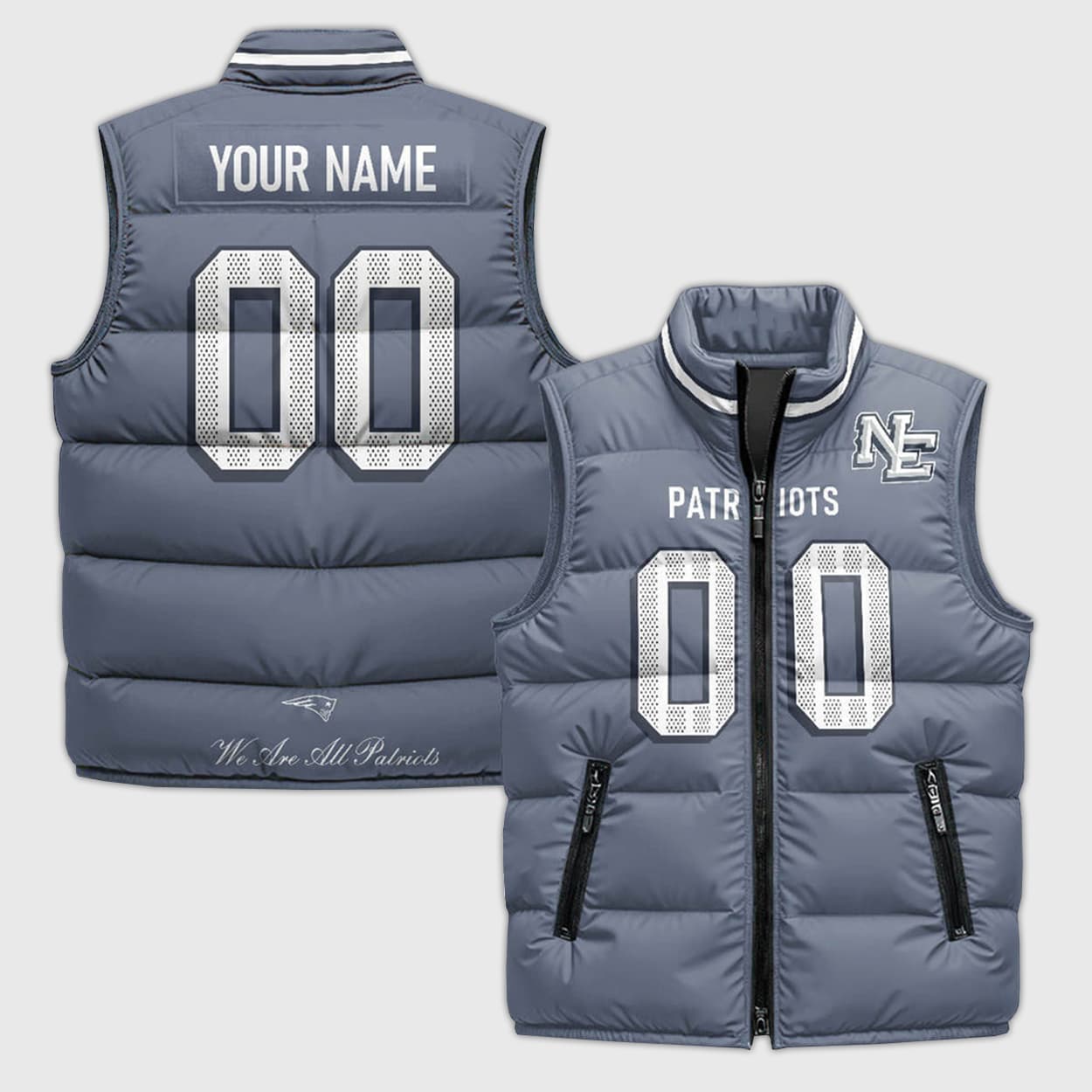 This vest features “PATRIOTS” emblazoned across the chest above the number “00,” with the classic “NE” logo proudly perched on the upper left. Flip it around and you’ll find your custom name above the same number—because every fan deserves a jersey moment. Near the bottom, the phrase “We Are All Patriots” adds a heartfelt touch in elegant cursive, reminding us that team pride runs deep.