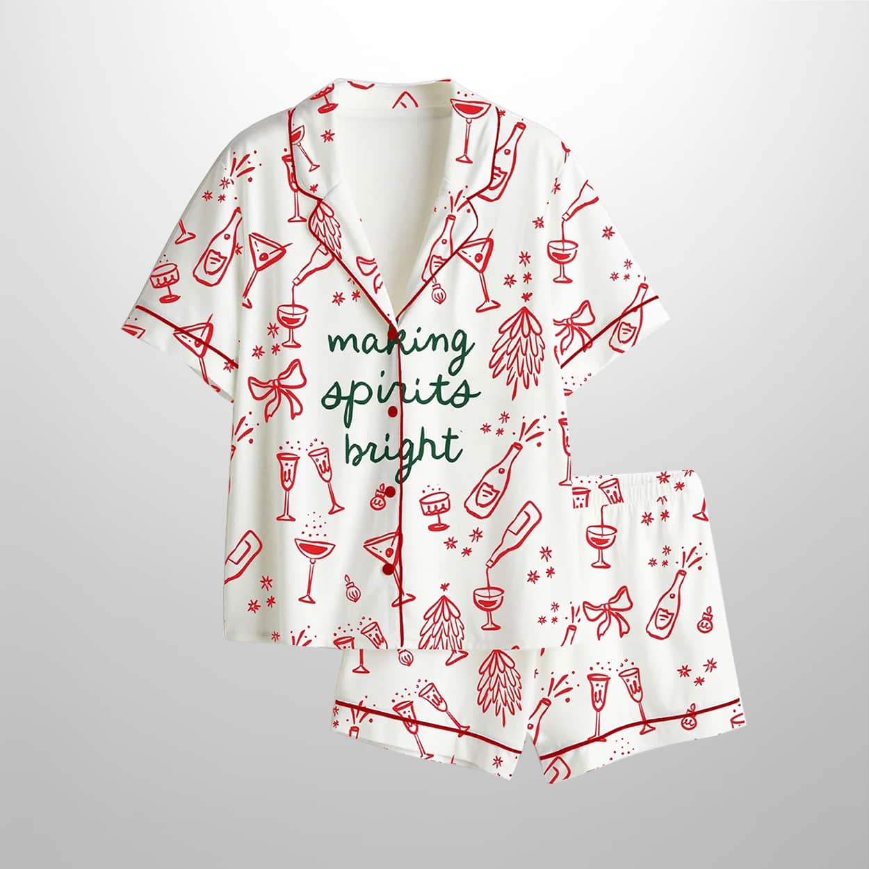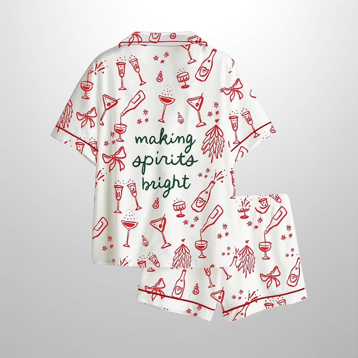 Raise a glass to cozy nights and sparkling style with this pajama set. This short-sleeved button-up shirt and matching shorts are decked out in a lively print of champagne bottles, flutes, bows, holly, and snowflakes—all dancing across a crisp white background. The phrase “making spirits bright” is playfully scripted in green cursive across the shirt, setting the tone for a season of joy and celebration. Red and green accents add a classic holiday touch, making this set perfect for lounging, gifting, or hosting your next festive soirée.