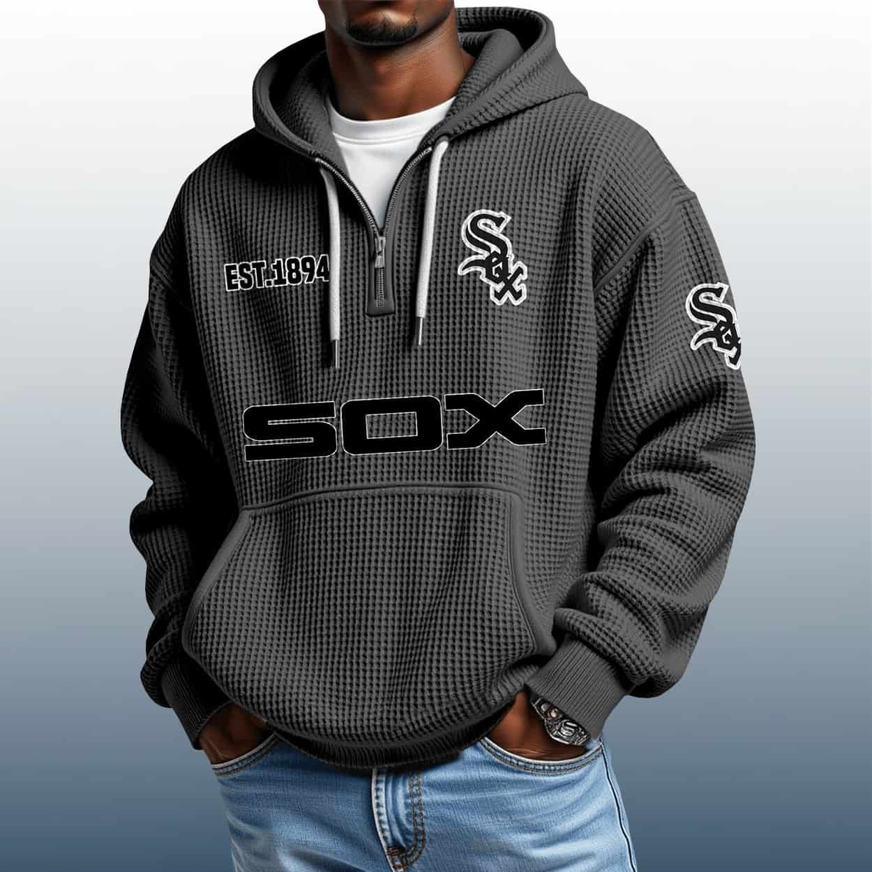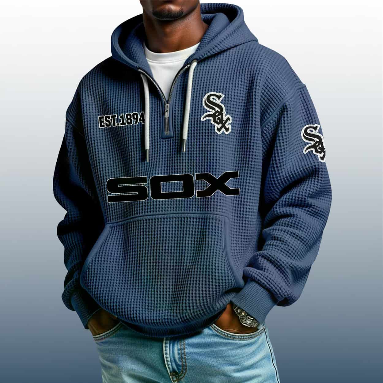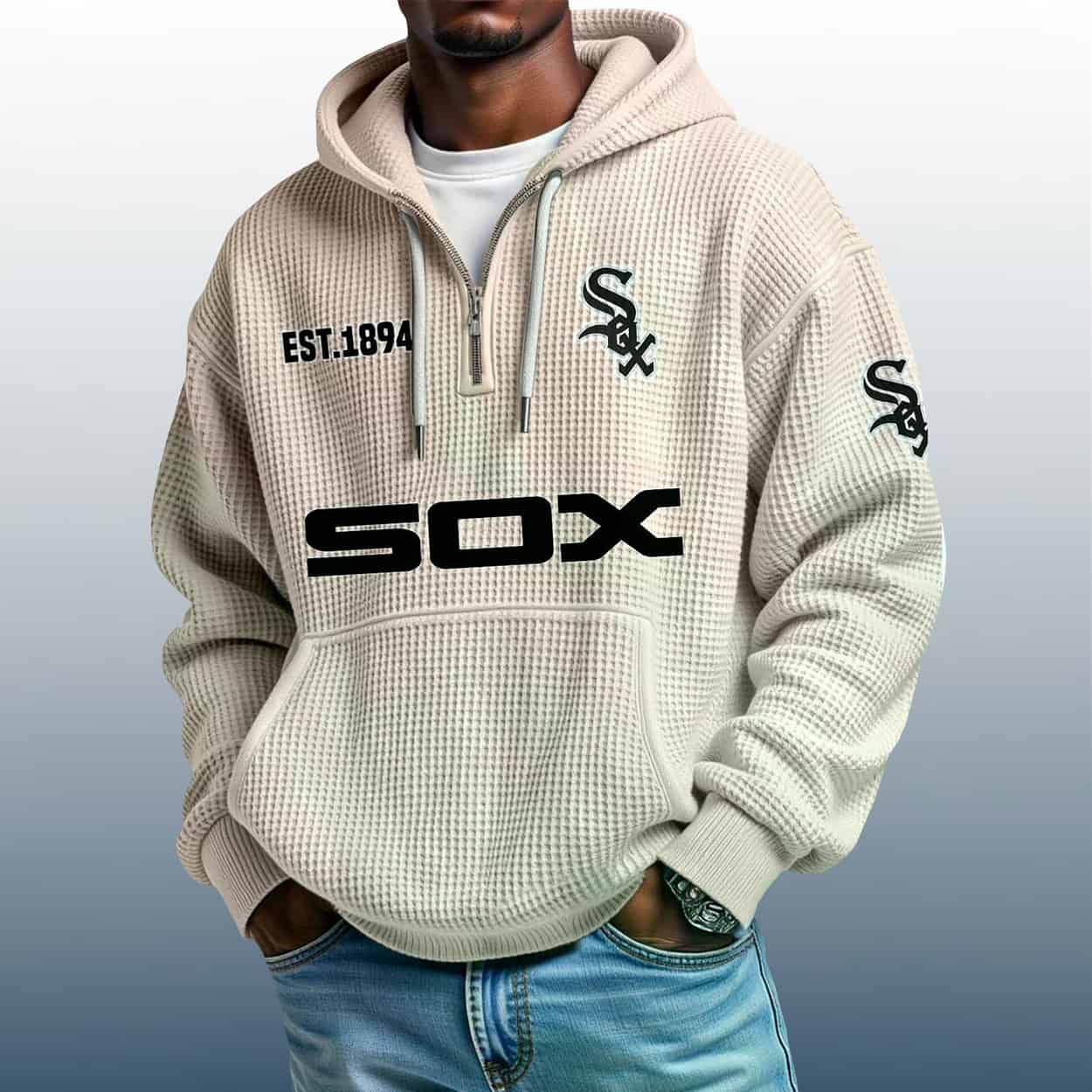 Step up your fan game with the White Sox Est 1894 Quarter Zip Waffle Hoodie—where bold graphics meet vintage team pride in a textured, standout design.