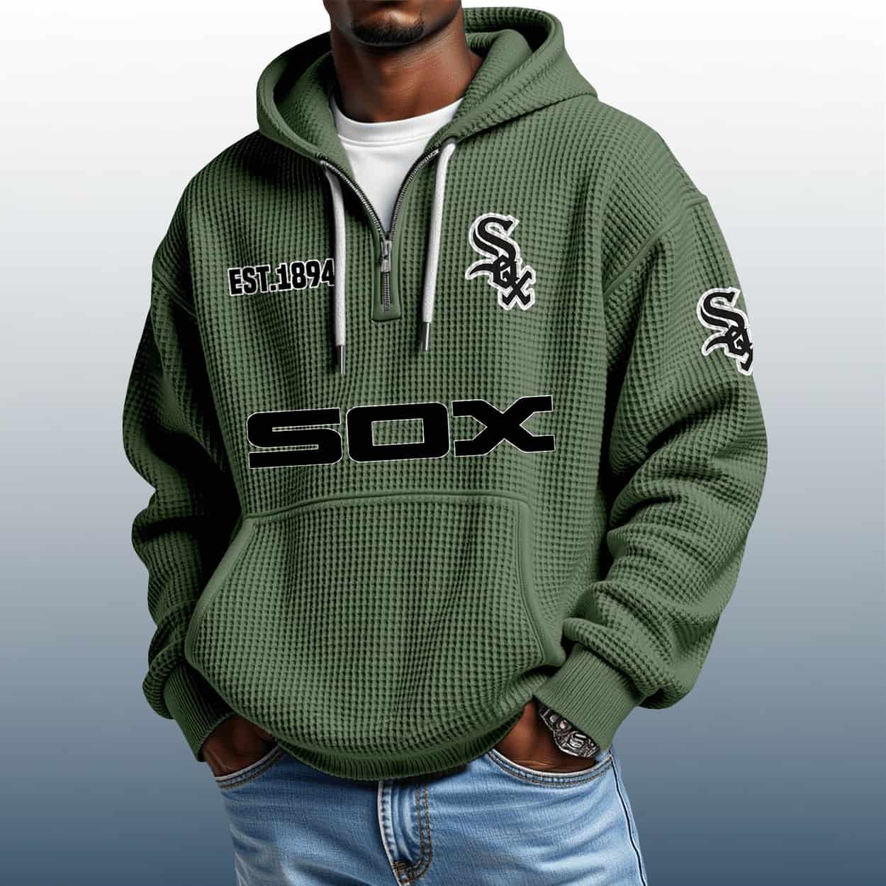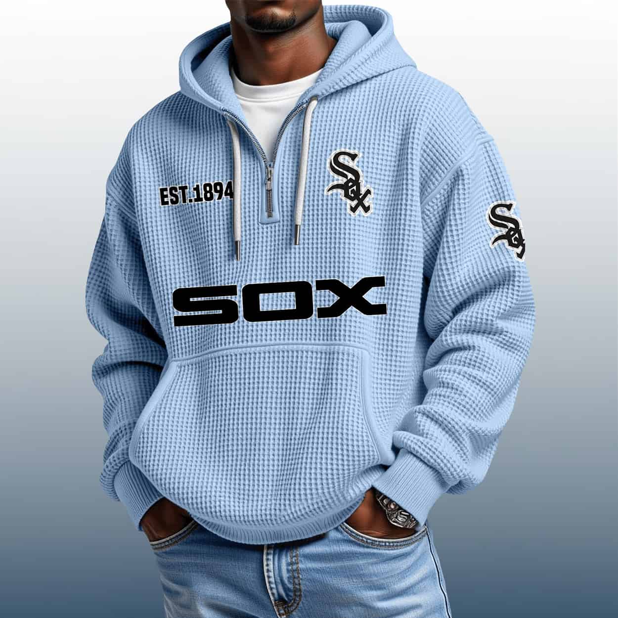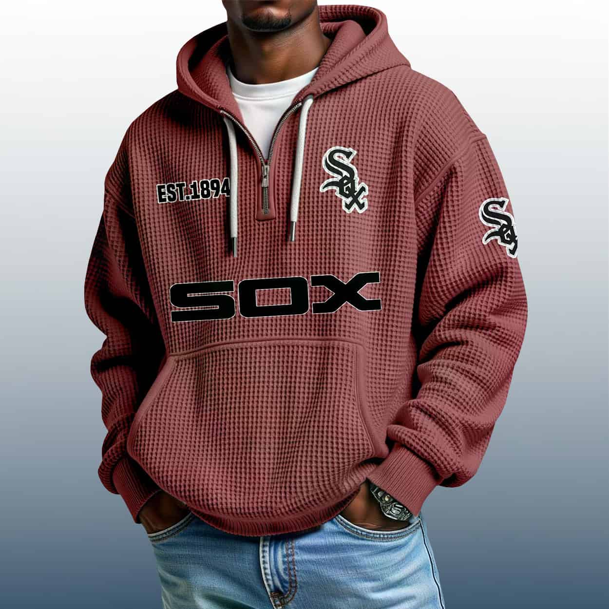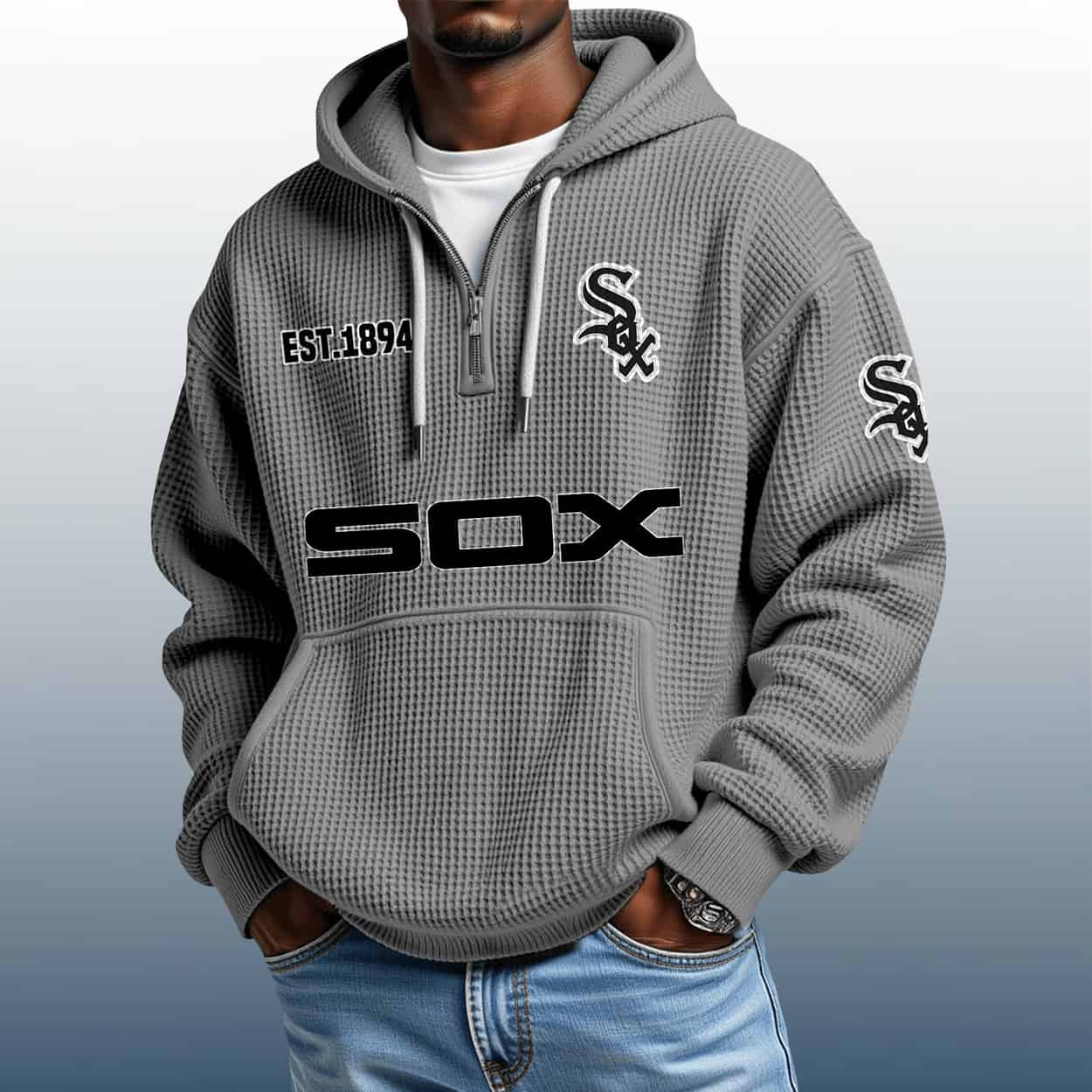 Step up your fan game with the White Sox Est 1894 Quarter Zip Waffle Hoodie—where bold graphics meet vintage team pride in a textured, standout design.