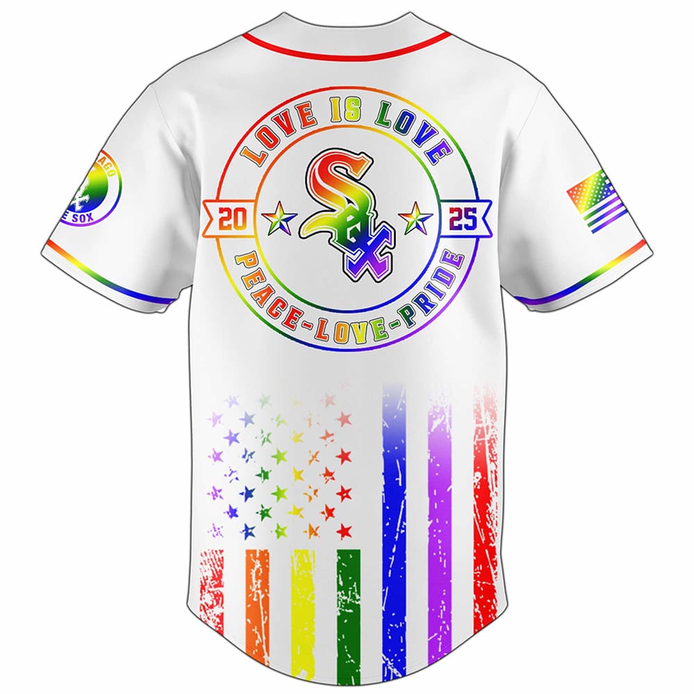 Step into the game with the White Sox Happy Pride Month Jersey 2025, a stunning fusion of team pride and rainbow celebration! This baseball jersey is a fan favorite, designed to shine on and off the field. The front boasts “White Sox” in sleek orange cursive, with a rainbow gradient enhancing the iconic “S,” paired with a cute rainbow heart near the chest. A sleeve patch blends an American flag with rainbow stripes, adding a patriotic twist. Turn it around, and the back dazzles with a circular “Love is Love” design, featuring a rainbow “S” and “2025,” set against a flowing rainbow flag backdrop that stretches down the jersey. This jersey keeps you comfortable whether you’re cheering at the stadium or joining a Pride event.