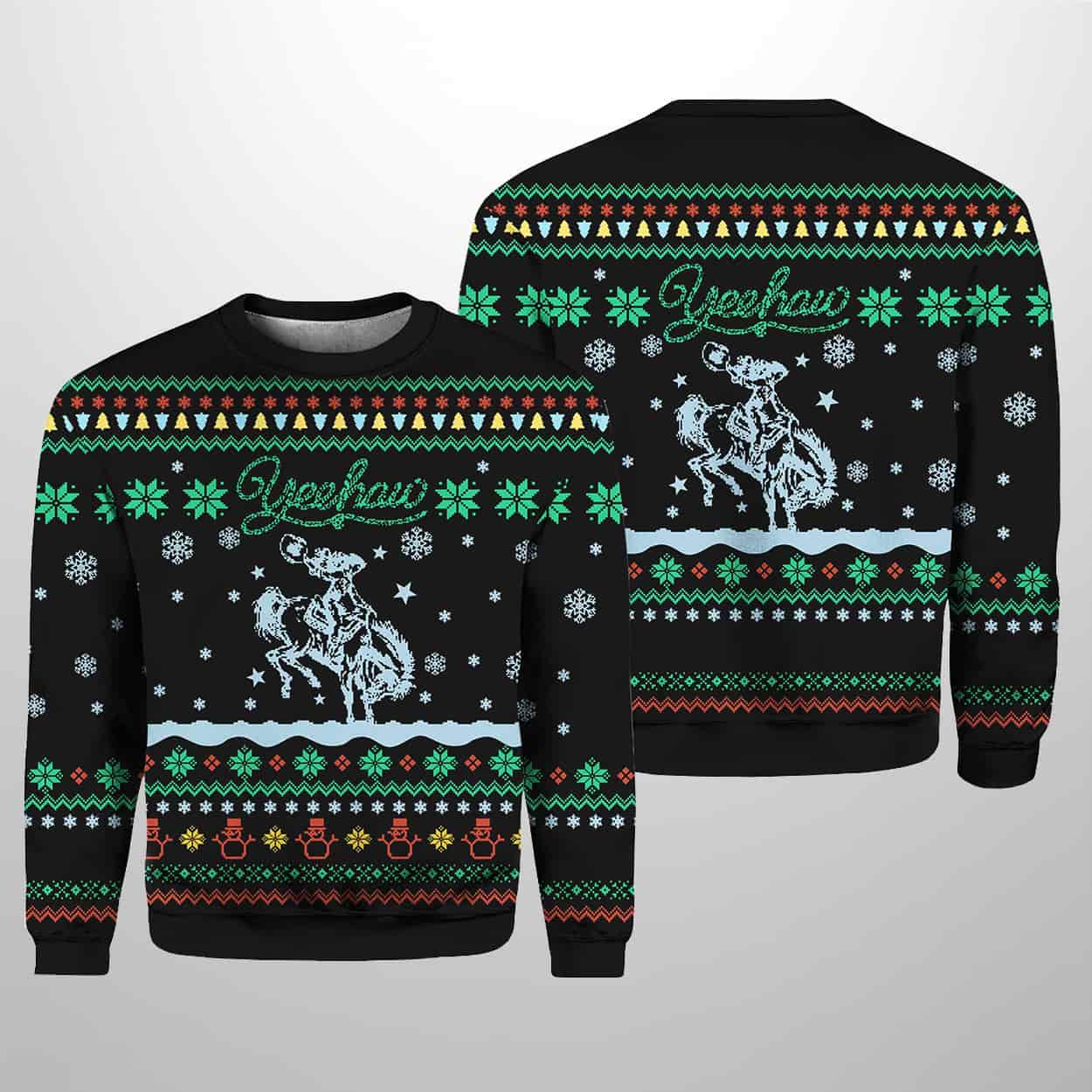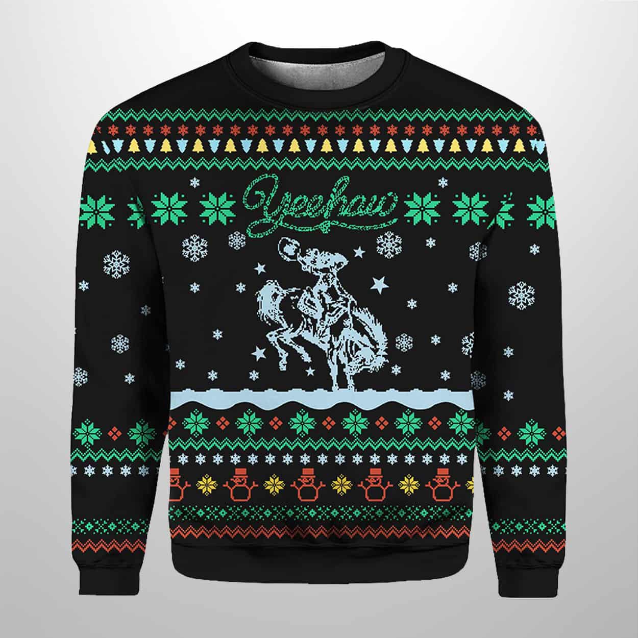 This unique black crewneck sweater is your ticket to a “Yeehaw” holiday season, blending traditional ugly Christmas sweater elements with a fun, rootin’-tootin’ rodeo twist. The front and back prominently feature a striking white silhouette of a cowboy or cowgirl atop a bucking bronco in a snowy landscape. The word “Yeehaw” is scrawled in a playful cursive script above the snowy scene, surrounded by scattered white snowflakes and chunky green and red starburst snowflakes.
