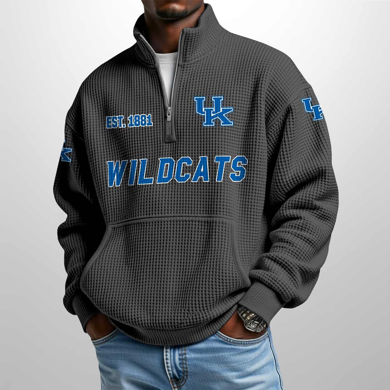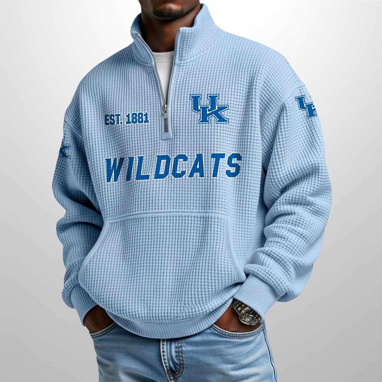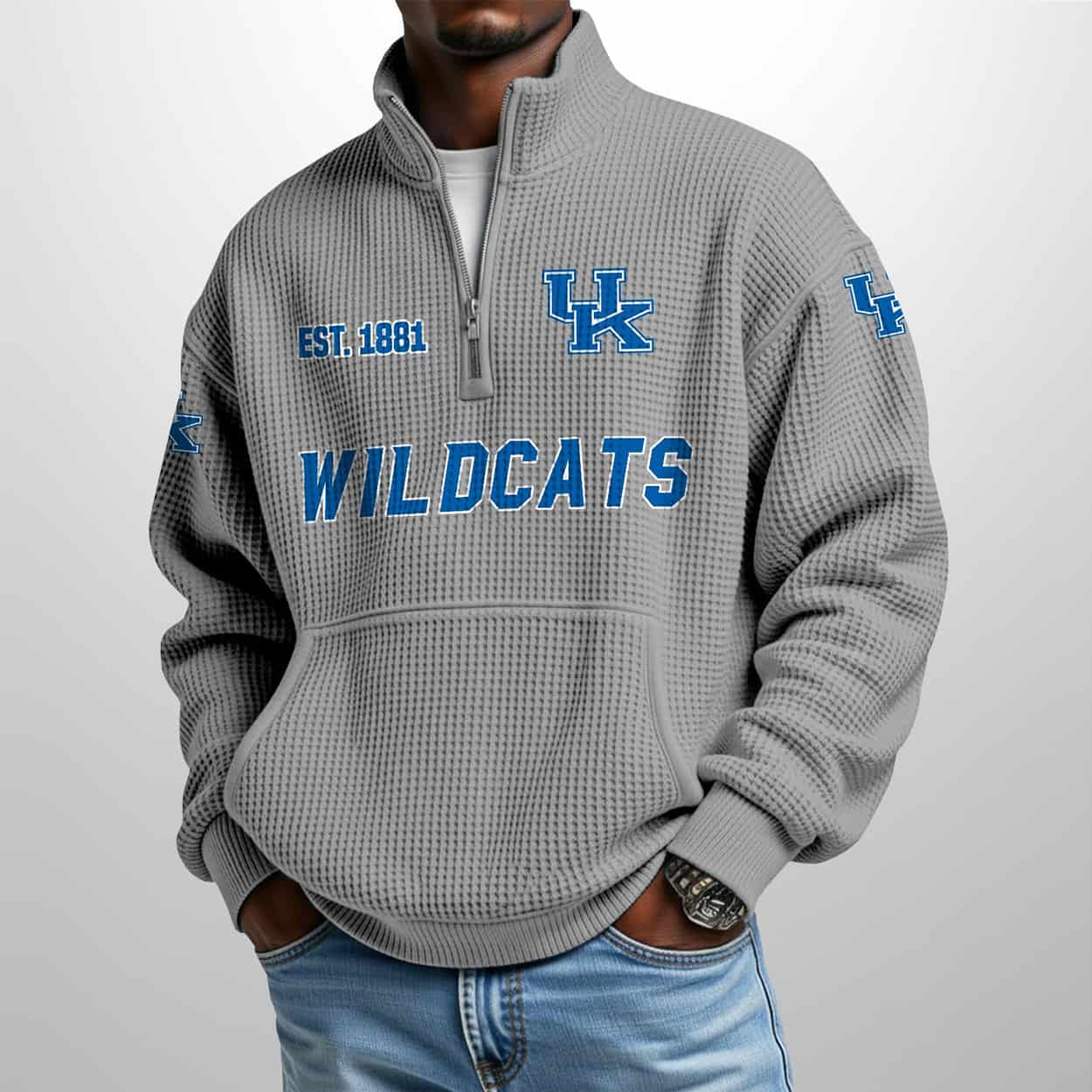 Elevate your fan gear with a piece that feels as good as it looks. Whether you’re courtside or enjoying a crisp autumn day, this half-zip ensures you represent the Wildcats with unparalleled flair. Don’t wait for the next tip-off—secure your Wildcats Est 1881 Waffle Stand Collar Half Zip Sweatshirt today and wear your blue with pride!