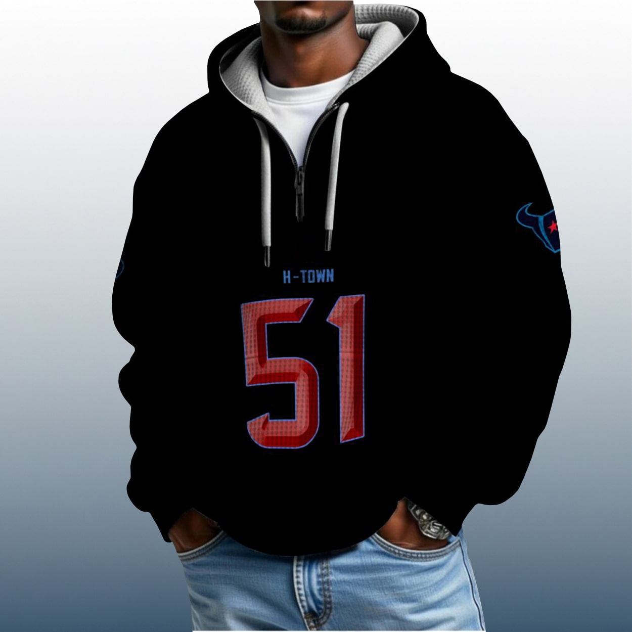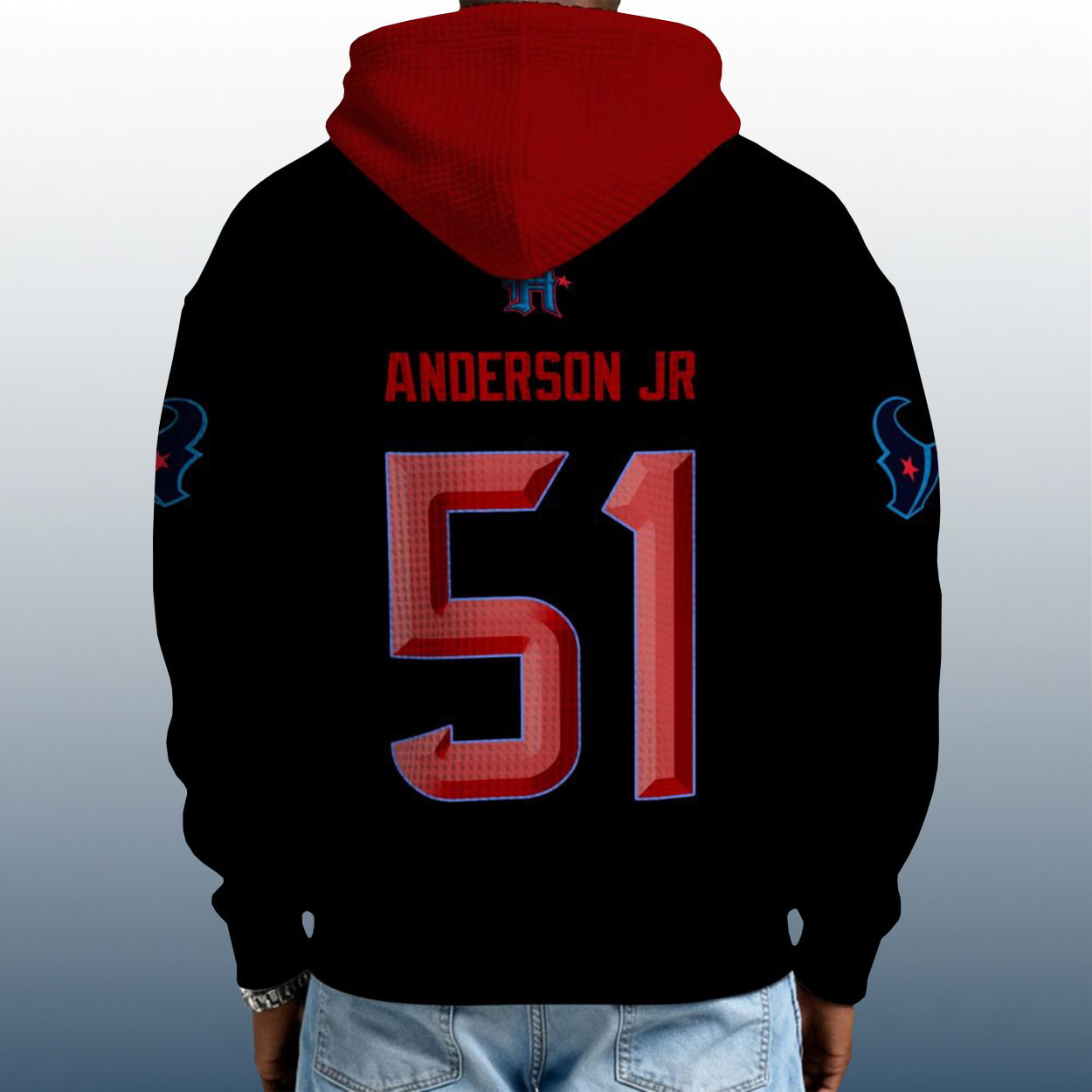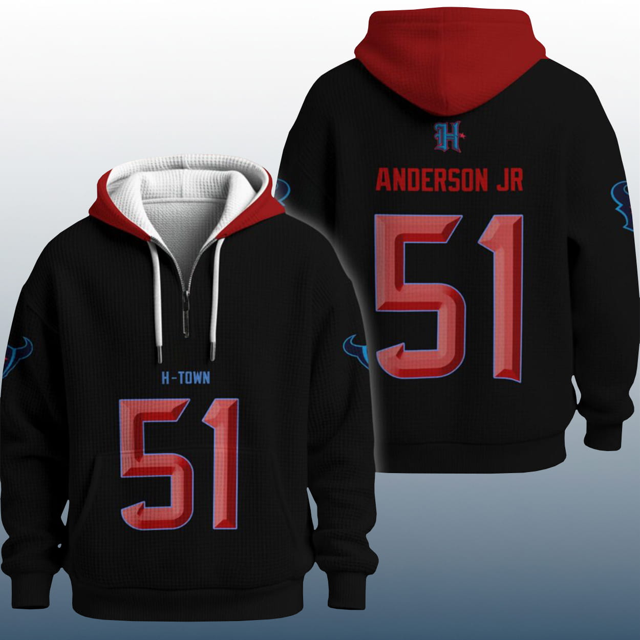 Step into the spotlight with this hoodie—a fan essential that fuses fierce style with gridiron grit. The front features “H-TOWN” in bold blue lettering above a striking red-and-blue number “51,” setting the tone for serious Houston pride. Flip it around and you’ll find “ANDERSON JR” stamped in red above the same number, crowned with a sleek “H” logo that adds a touch of signature flair. The red outer hood and white inner lining bring contrast drama, while both sleeves flex blue bull head logos that roar team loyalty.
