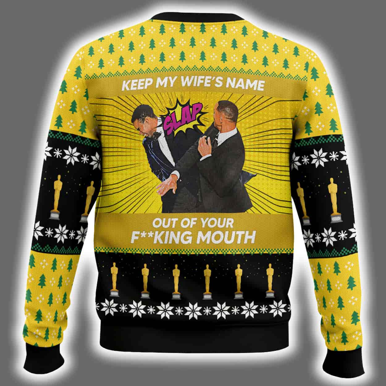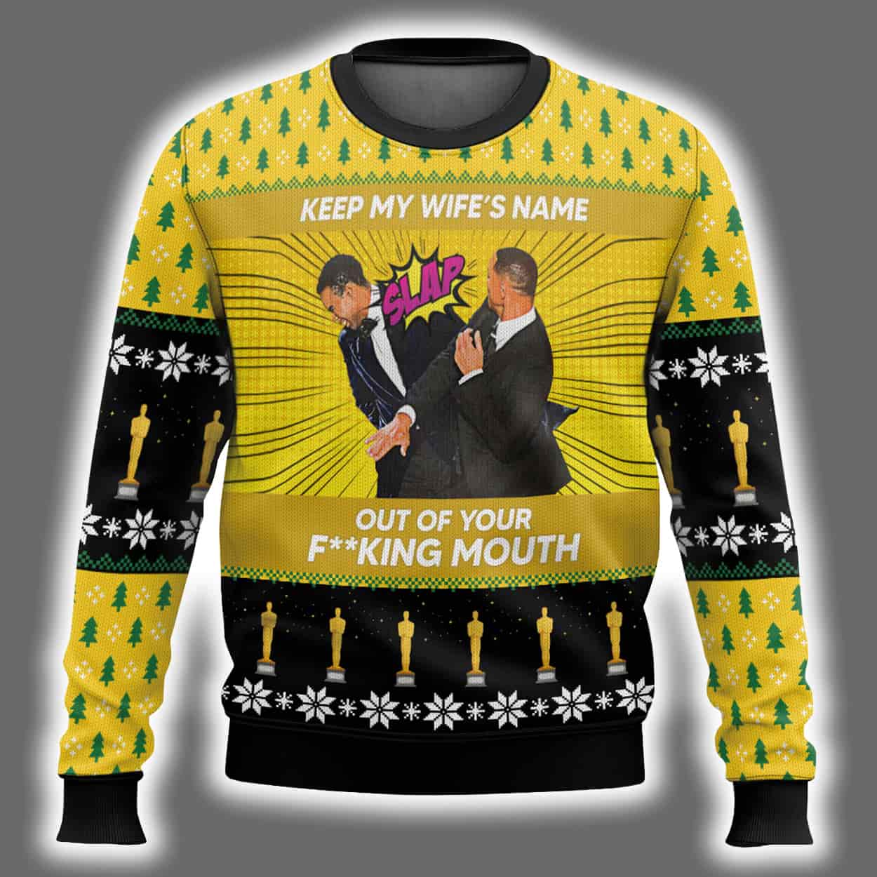 Get ready to sleigh the holiday party circuit with a sweater that’s anything but silent night. This eye-popping design features a comic-style graphic of Will Smith delivering the now-infamous slap to Chris Rock, complete with a dramatic “BAP!” sound effect. Framed by radiant yellow burst lines, the scene is captioned with the unforgettable phrase: “KEEP MY WIFE’S NAME OUT OF YOUR F**KING MOUTH.” Surrounding the central image are festive motifs—pine trees, snowflakes, and golden statuettes—that blend holiday cheer with red carpet drama. It’s not just a sweater; it’s a conversation starter.
