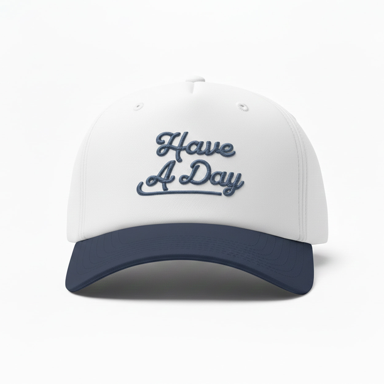 This hat is a masterclass in understated wit. Featuring a crisp white crown and a deep navy brim, this cap keeps it clean while delivering a punch of personality. Embroidered front and center in elegant navy cursive is the phrase “Have A Day”—a delightfully ambiguous message that leaves interpretation up to the beholder. Whether you’re feeling ironic, optimistic, or just plain neutral, this hat fits the mood. It’s the perfect accessory for casual outings, coffee runs, or spontaneous philosophical debates.