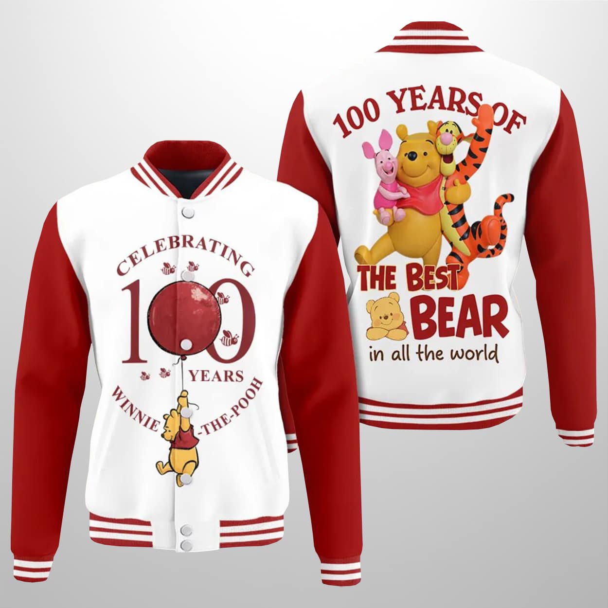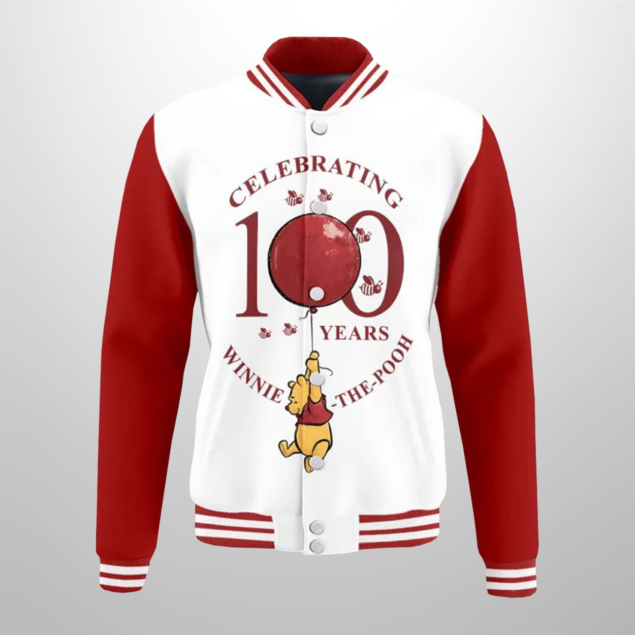 Step into a storybook with this jacket — a varsity-style celebration of timeless friendship and honey-loving adventures. With vibrant red sleeves and a crisp white body, this jacket pops with playful energy. The front proudly reads “CELEBRATING 100 YEARS WINNIE THE POOH,” accompanied by a cheerful image of Pooh floating with his signature balloon. Turn around, and you’ll find a heartwarming tribute: “100 YEARS OF THE BEST BEAR in all the world,” surrounded by colorful illustrations of Pooh, Piglet, and Tigger in full celebratory spirit.