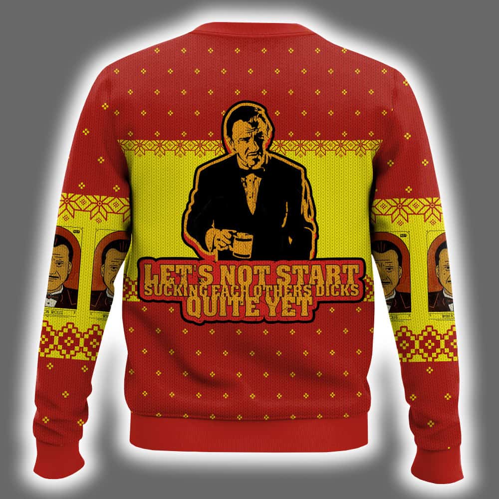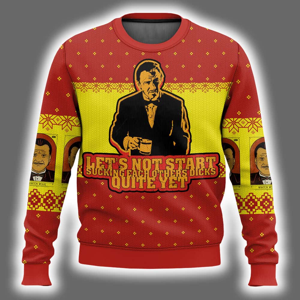 Deck the halls with unapologetic swagger in this outrageous holiday sweater featuring Winston Wolf, the ever-composed fixer from Pulp Fiction. With a vibrant red and yellow palette, snowflake motifs, and geometric holiday patterns, this sweater screams festive—but with a smirk. Front and center is Mr. Wolf himself, pointing and grinning in his signature tuxedo, surrounded by smaller portraits of his iconic expression along the sleeves and sides. And yes, emblazoned across the chest is his unforgettable line: “Let’s not start sucking each other’s dicks quite yet.” It’s not just a quote—it’s a conversation starter.