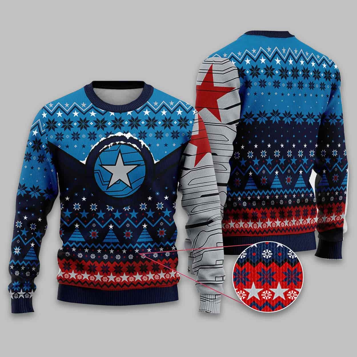 This unique, heavy-knit sweater brings a touch of Marvel villain-turned-hero flair to your holiday wardrobe. The key features include the Winter Soldier’s metal arm design graphically printed on the sleeve. The sweater’s body is filled with a fun mix of snowflakes, Christmas trees, and the prominent white star logo from his gear, all set against a blue, red, and white color palette.
