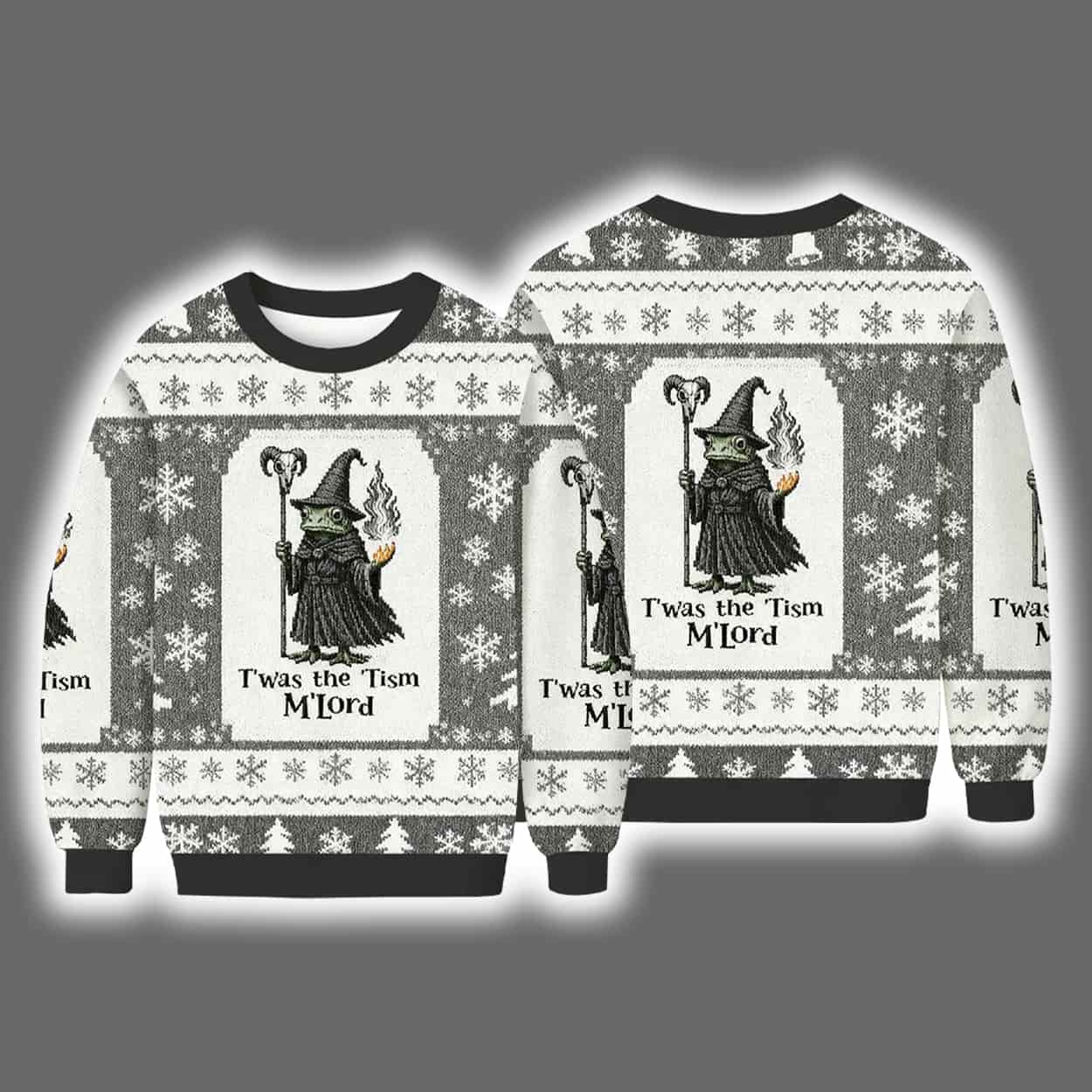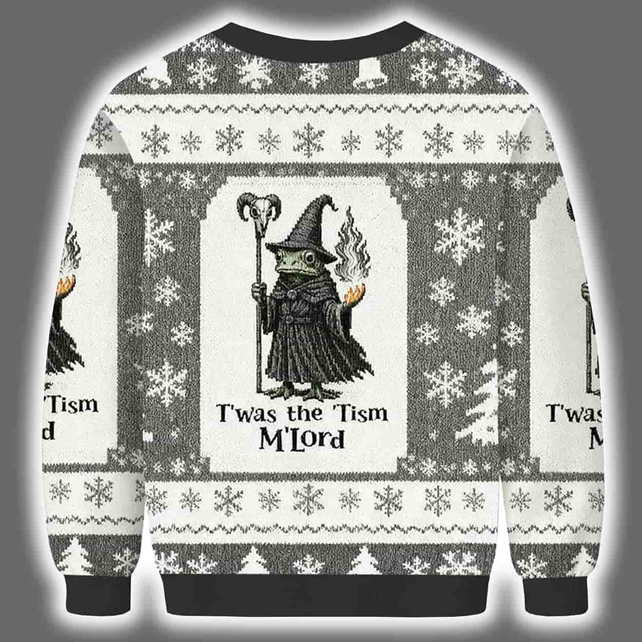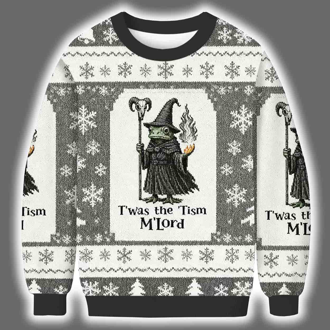 Step aside, Santa — the season’s true icon is here. This sweater features a grayscale wizard-like frog character, complete with a pointed hat, staff, and goblet, surrounded by snowflakes and winter motifs in a symmetrical holiday pattern. With green accents on the face and a commanding presence, this amphibious mage brings a mystical twist to traditional holiday wear. The phrase “T’was The ’Tism M’Lord” boldly crowns the design, adding a layer of internet-born absurdity that’s equal parts cryptic and hilarious.
