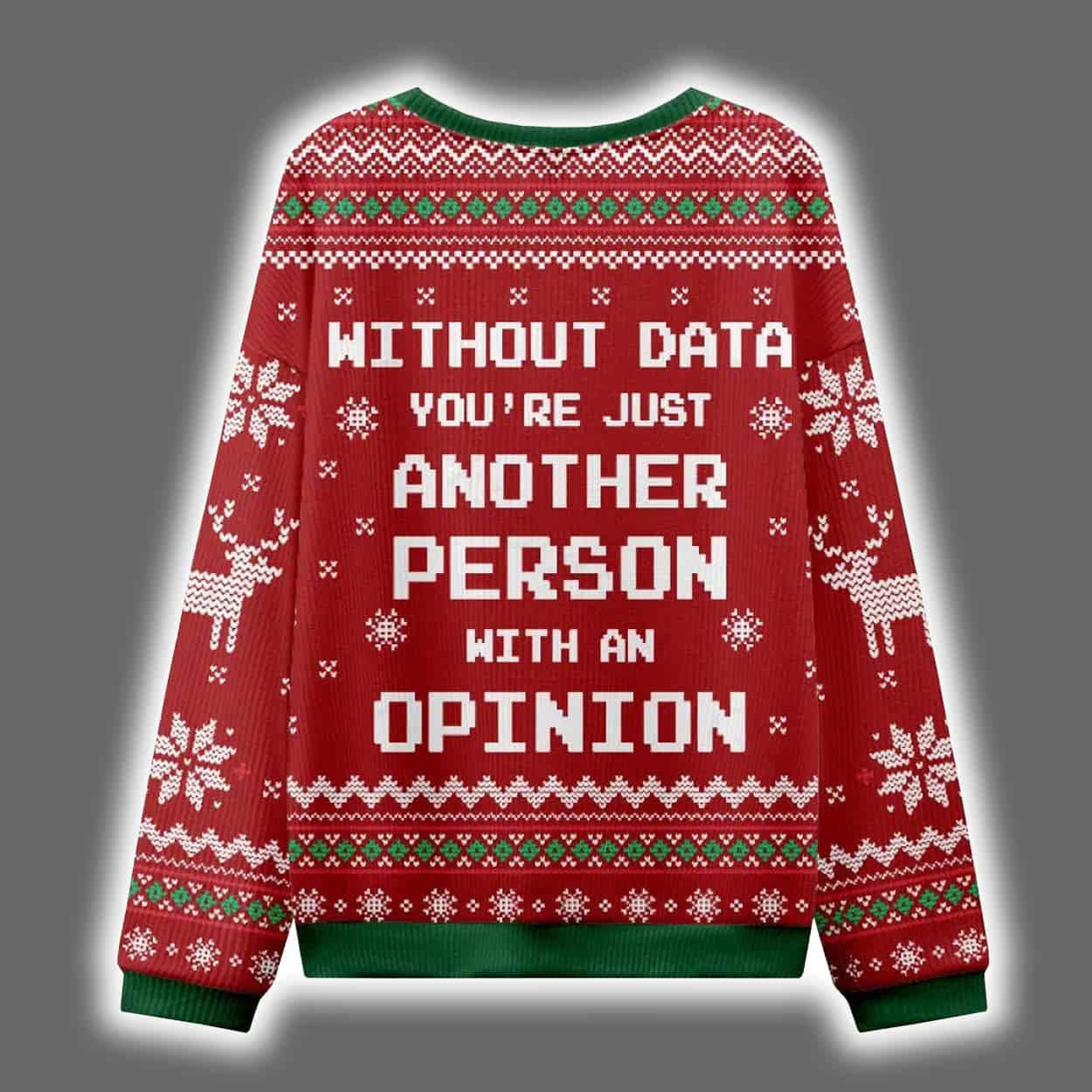 This isn’t just a sweater—it’s a declaration wrapped in holiday cheer. Drenched in vibrant red with green and white accents, it features classic knit-style patterns of snowflakes, reindeer, and geometric shapes that scream Christmas nostalgia. But front and center is the real showstopper: a bold, white proclamation that reads, “WITHOUT DATA YOU’RE JUST ANOTHER PERSON WITH AN OPINION.” It’s cheeky, it’s clever, and it’s bound to spark conversation at every holiday gathering—from office parties to family dinners.