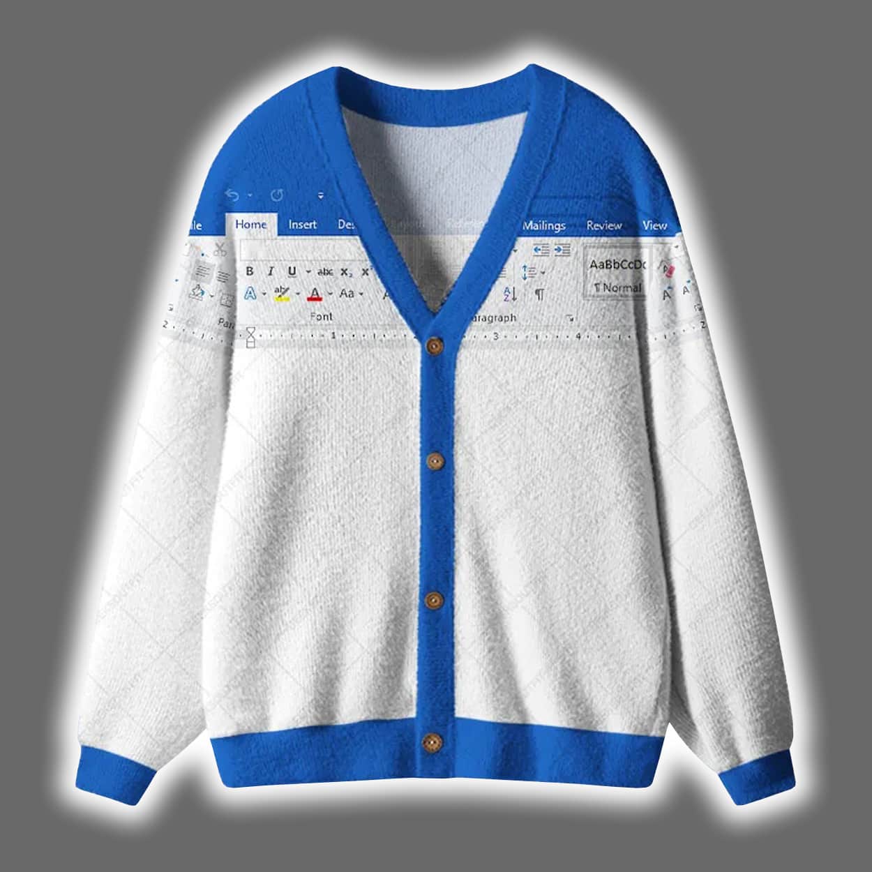 Deck the halls with digital flair in this cardigan, a clever twist on holiday wear for tech lovers and heroes alike. This cardigan features bold blue accents on the collar, cuffs, and hem, framing a full-print design that mimics the iconic Microsoft Word interface. From the “File” tab to “Review” and “View,” the toolbar stretches across the front and back, complete with formatting icons like bold, italic, underline, bullet points, and alignment tools. It’s a wearable homage to the world’s favorite word processor—perfect for anyone who’s ever spent a little too much time tweaking margins or chasing deadlines.