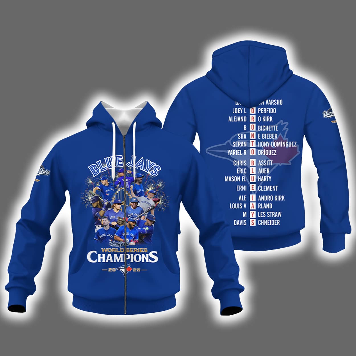 This hoodie is a full-throttle celebration of Toronto’s baseball triumph. The front explodes with energy—“BLUE JAYS” blazes across the chest above a dynamic graphic of players in action, set against a backdrop of fireworks that scream victory. Beneath the scene, “WORLD SERIES CHAMPIONS” is stamped in bold, with the Blue Jays logo anchoring the moment. Turn it around and the back delivers a heartfelt tribute: a full roster of players and staff, each name paired with a Blue Jays logo icon, arranged in clean columns that honor every contributor to the win.