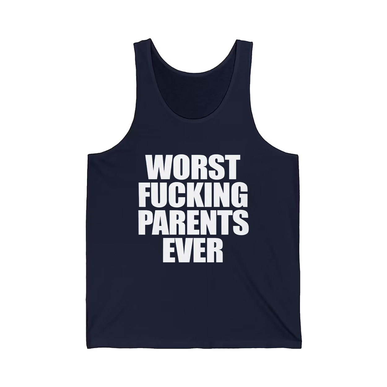 This isn’t just a shirt—it’s a motion. This shirt is designed to grab attention and never let go. With its navy backdrop and stark white lettering, the message is loud, clear, and impossible to ignore. The phrase “WORST FUCKING PARENTS EVER” is stacked in bold block letters across the chest, centered and evenly spaced for maximum readability. There are no graphics, no distractions—just pure, unapologetic text that hits like a well-timed joke.