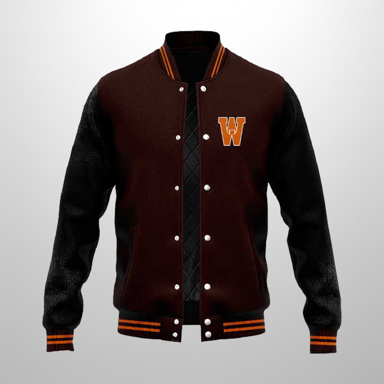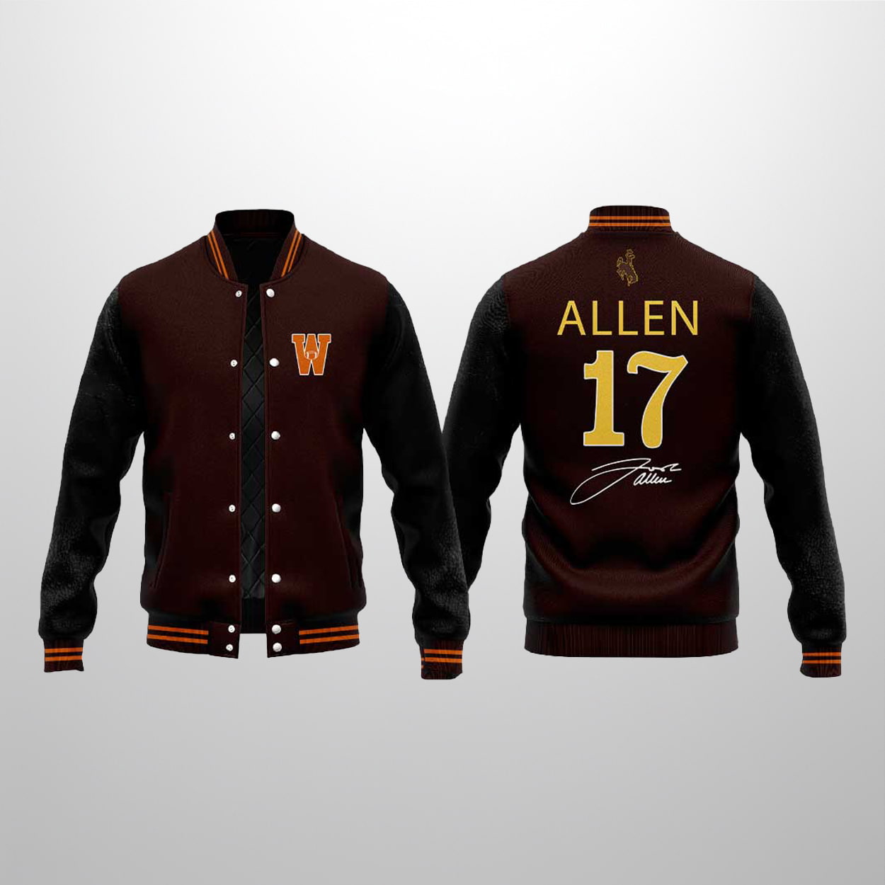 Step into the spotlight with the Wyoming Football Josh Allen 17 2025 Baseball Jacket—a tribute to gridiron greatness and fearless style. This varsity-inspired piece boasts a rich dark brown body paired with sleek black sleeves, electrified by orange and yellow accents that demand attention. On the front, a bold orange “W” outlined in yellow sits proudly on the chest, while striped cuffs and collar add a punch of retro flair. Flip it around and you’ll find “ALLEN” blazing across the shoulders in yellow, with the number “17” anchoring the look below. A stylized white signature adds a final touch of swagger.