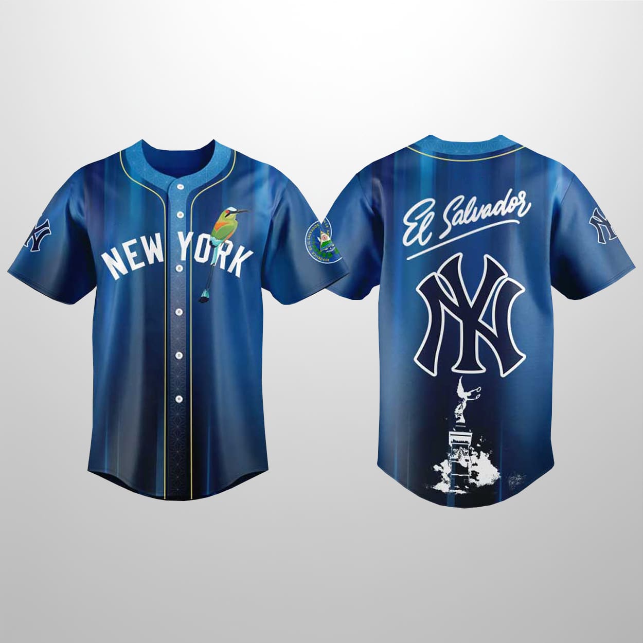 Bring a touch of the “Land of Volcanoes” to the Bronx with a design that hits it out of the park! This jersey trades traditional pinstripes for a stunning deep blue gradient and sleek vertical light-blue accents. On the front, the arched “NEW YORK” block lettering is accompanied by a colorful Torogoz—El Salvador’s national bird. The back features “El Salvador” in an elegant white script positioned above the legendary interlocking “NY” logo, while the lower back displays a crisp white silhouette of the Monumento al Divino Salvador del Mundo.