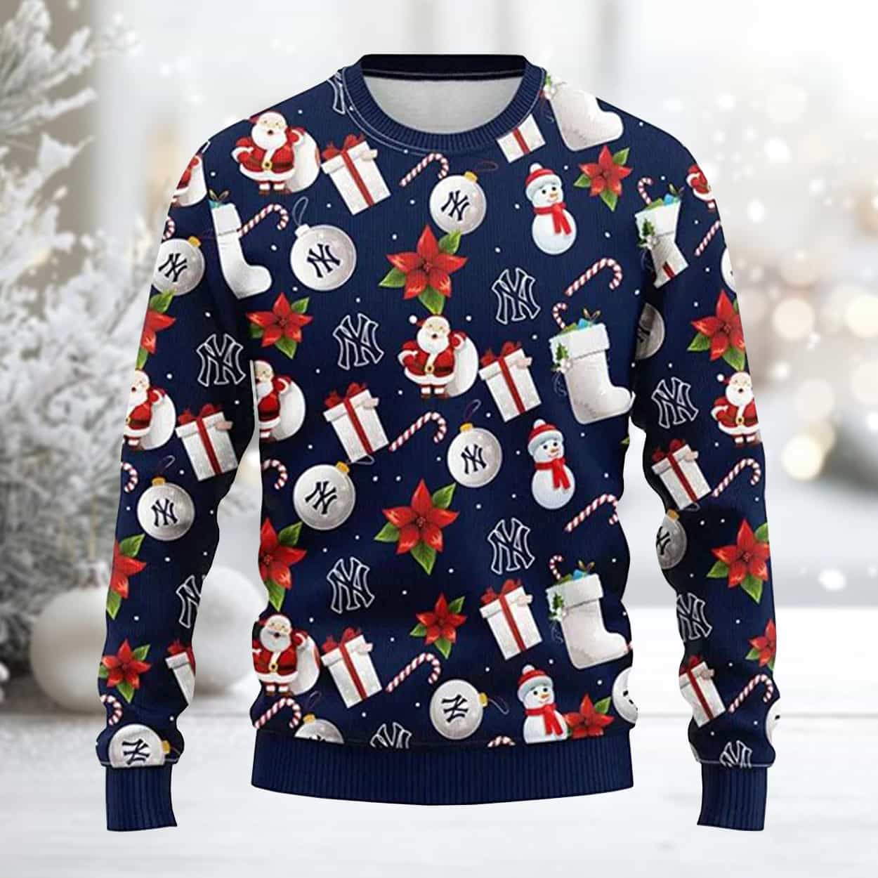 This sweater is a grand slam of holiday fun for New York Yankees fans. Set against a deep navy blue background, it’s decked out with cheerful snowmen, jolly Santas, candy canes, red poinsettias, white stockings trimmed in green, and wrapped gift boxes. Scattered throughout the design are white baseballs and standalone logos featuring the iconic Yankees “NY,” blending team pride seamlessly into the festive chaos. The pattern wraps around the entire sweater, creating a vibrant, all-over print that’s perfect for holiday parties, chilly game nights, or cozy evenings by the fire.