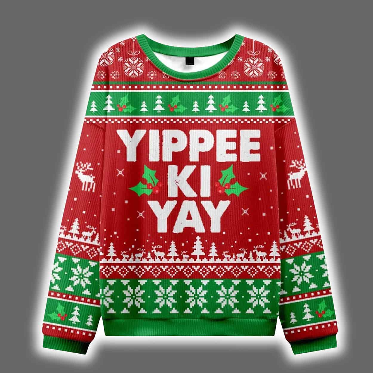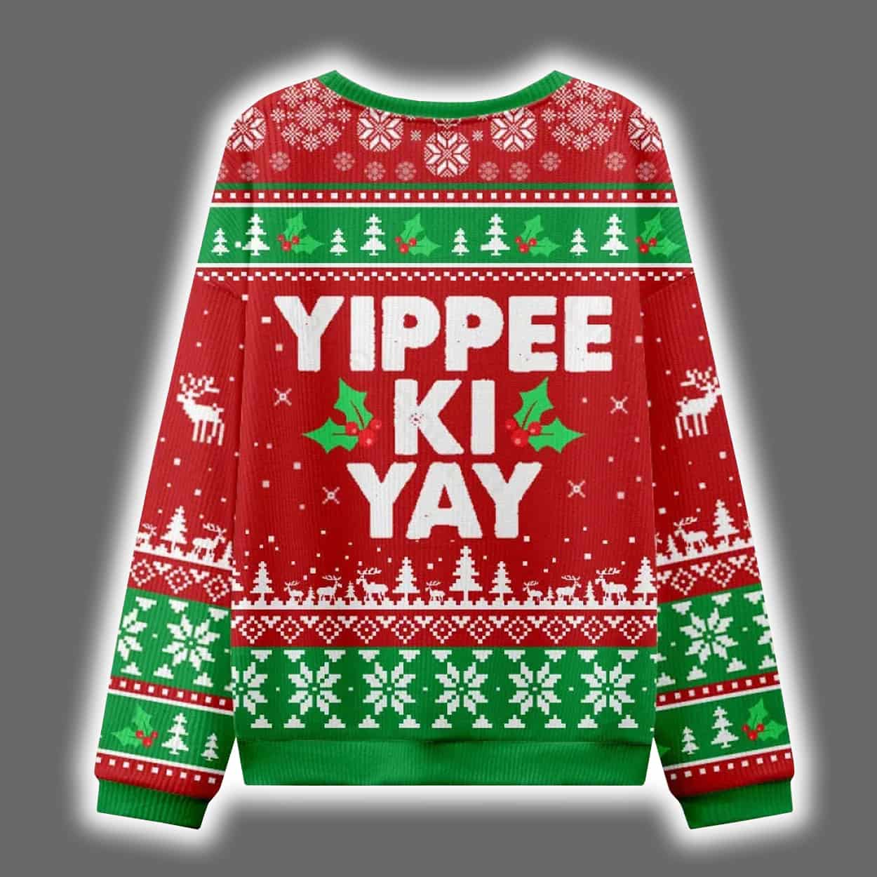 Deck the halls—and your wardrobe—with a sweater that’s equal parts festive and fierce. This sweater bursts with holiday spirit in a classic red, green, and white palette. Snowflakes, reindeer, holly leaves, and Christmas trees dance across the design in symmetrical harmony, while the bold white text “YIPPEE KI YAY” takes center stage. Flanked by two green holly leaves, the phrase pops with playful energy, making this sweater a standout at any holiday gathering.