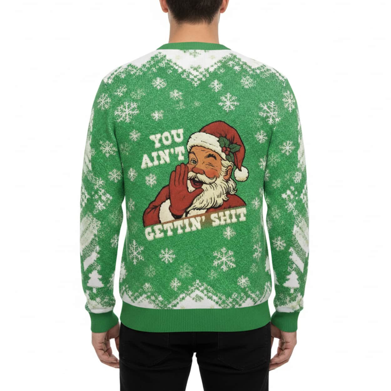 Forget cookies and milk—this Santa’s serving up straight attitude. This sweater is a bold green holiday piece featuring a cartoon Santa mid-sass, hand raised in a classic “talk to the mitten” gesture. Surrounded by snowflake patterns and festive flair, he delivers the ultimate holiday mic drop with the phrase “YOU AIN’T GETTIN’ SHIT” in unapologetic white text. It’s the perfect blend of seasonal spirit and savage humor, designed to make your holiday wardrobe anything but boring.