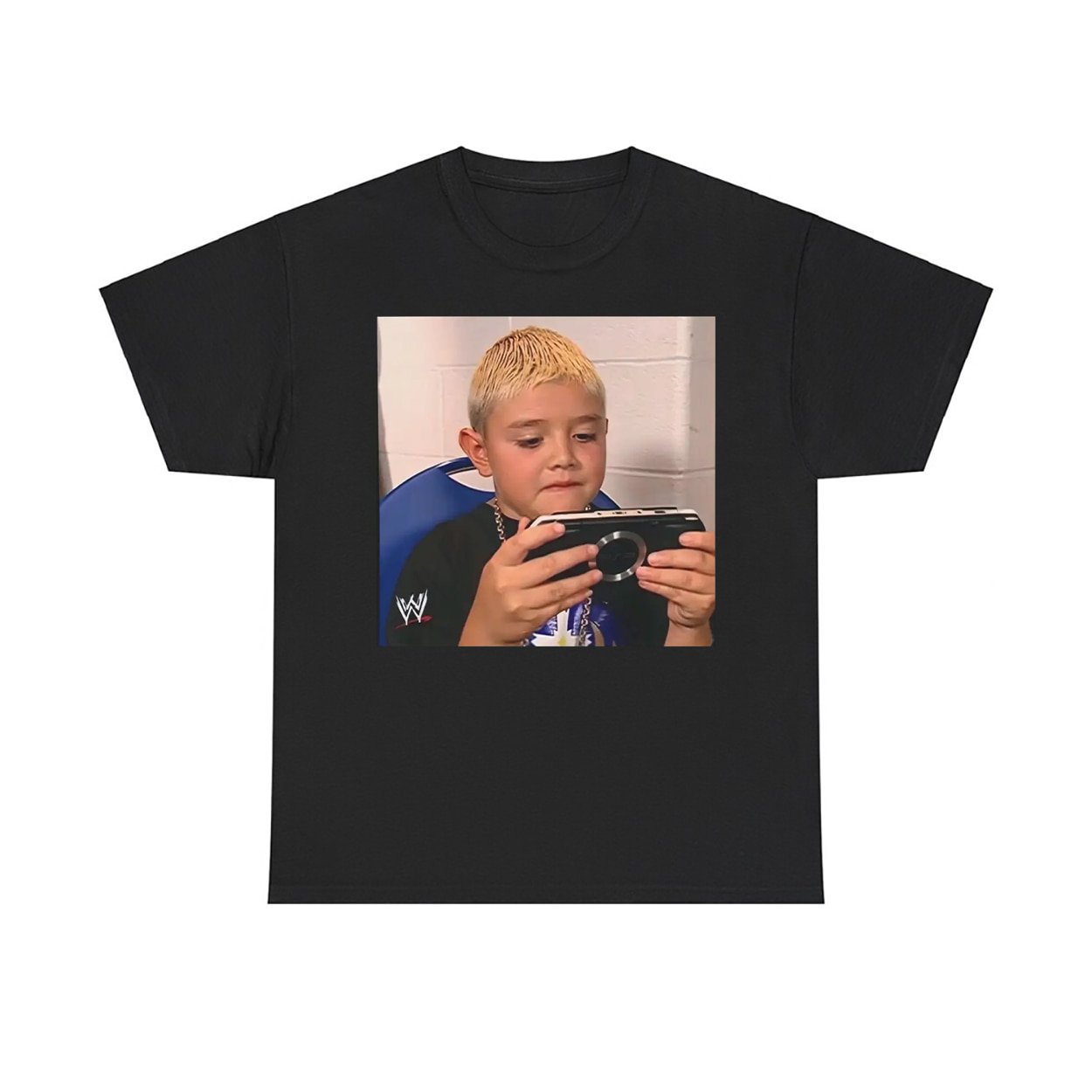 Step into a time capsule of pop culture with this shirt. This bold tee showcases a candid photo of a young Dominik Mysterio, bleached blonde and laser-focused on his PSP, seated against a white wall and blue chair. The WWE logo on his sleeve adds a punch of attitude, making this shirt a perfect fusion of wrestling heritage and gaming nostalgia. Whether you’re hitting a live show or just leveling up your streetwear game, this shirt turns heads and sparks conversations.