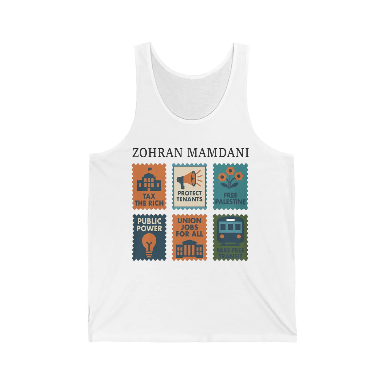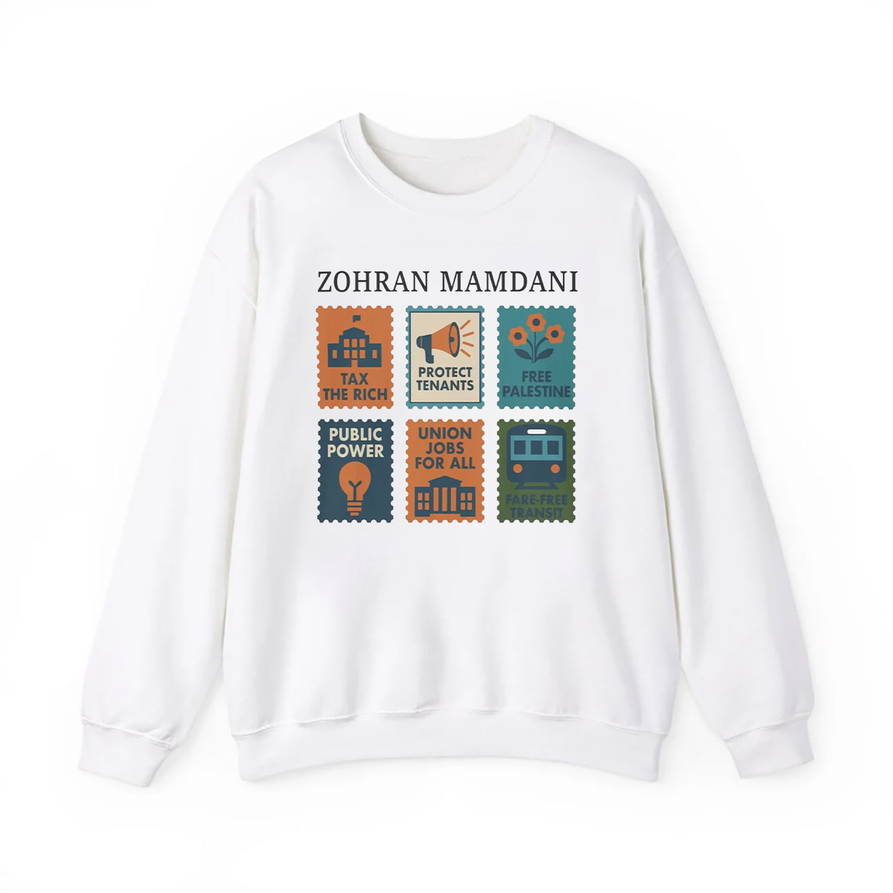 Step into the spotlight with this shirt — a vibrant, punchy piece that turns heads and sparks conversations. The front design features six postage stamp-style illustrations, each bursting with color and purpose. From “TAX THE RICH” paired with a towering building to “FREE SUBWAYS” riding alongside a sleek train, every stamp is a mini manifesto. Other slogans include “PROTECT TENANTS,” “PUBLIC POWER,” “UNION JOBS FOR ALL,” and a ballot box icon that says it all — democracy in action. Above it all, the name “ZOHRAN MAMDANI” crowns the design, tying the shirt to a movement that’s as stylish as it is serious.